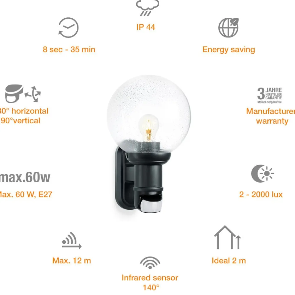 Udendørs væglampe L 560 S med bevægelsessensor, skumringssensor og klassisk sfærisk glasskærm Væglampen L 560 S passer til mange forskellige facadedesigns. Den mundblæste lampeskærm er et vidnesbyrd om traditionelt håndværk og giver denne smukke udendørslampe sit attraktive udseende. Fresnel-linsen kan drejes lodret og vandret, så registreringsområdet kan tilpasses præcist til de lokale forhold. Leveringsomfanget omfatter dækplader til begrænsning af registreringsområdet. Skumringstærsklen og lysets varighed kan nemt justeres ved hjælp af den integrerede drejeknap. Der kan maksimalt bruges en 60 W traditionel glødepære som lyskilde. L 560 S muliggør en registreringsvinkel på 140° i det vandrette område og er udstyret med krybesikring. Et område på maks. 12 m kan belyses. Drejeområde: vandret 180°, lodret 70°. Den justerbare lysvarighed er mellem 8 sekunder og 35 minutter. Skumringsindstilling: 2-2.000 lux. For at sensoren skal fungere korrekt, skal lampen installeres i en højde på maks. 3 meter. Væglampen er udstyret med IP44 og kan derfor modstå selv svære vejrforhold. Et hjørnebeslag er ikke tilgængeligt. Bemærk: Der kan købes reserveglas til den udendørs væglampe L 560 S med sensor i mindst 5 år.