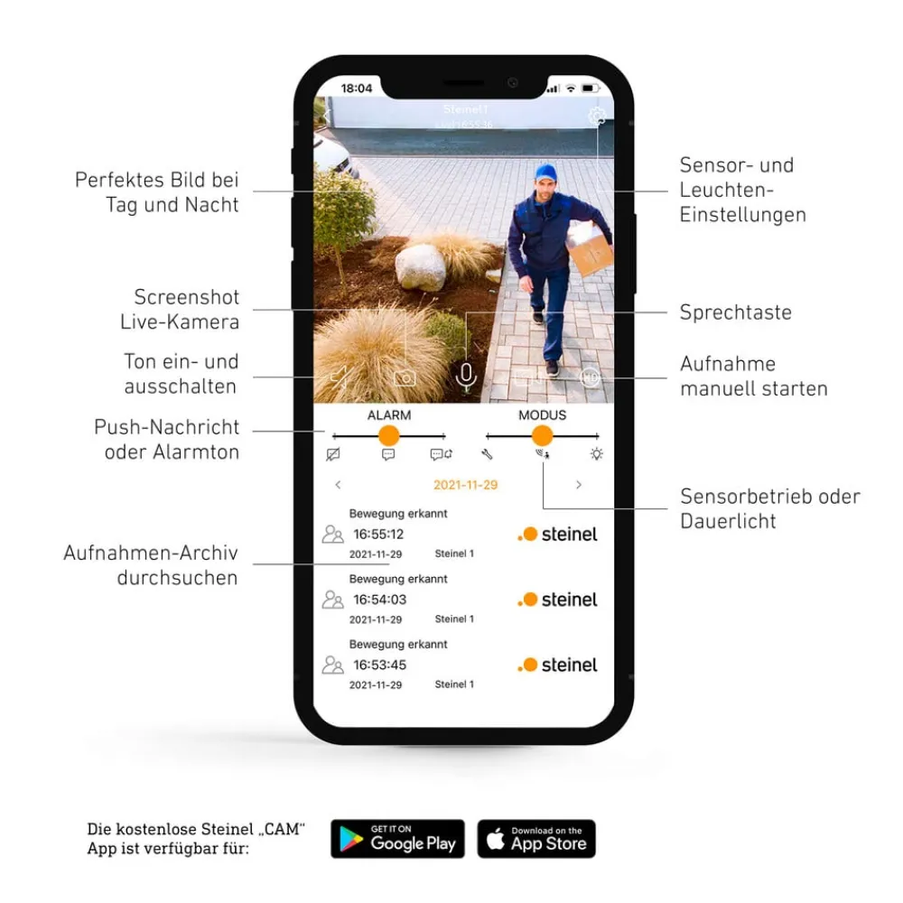 Det store højdepunkt er det integrerede HD-vidvinkel-farvekamera. Den leverer overvågningsbilleder i fremragende kvalitet, som også kan overføres straks til mobilenheden. Takket være det praktiske håndfri system har du endda mulighed for at kommunikere direkte med besøgende.
