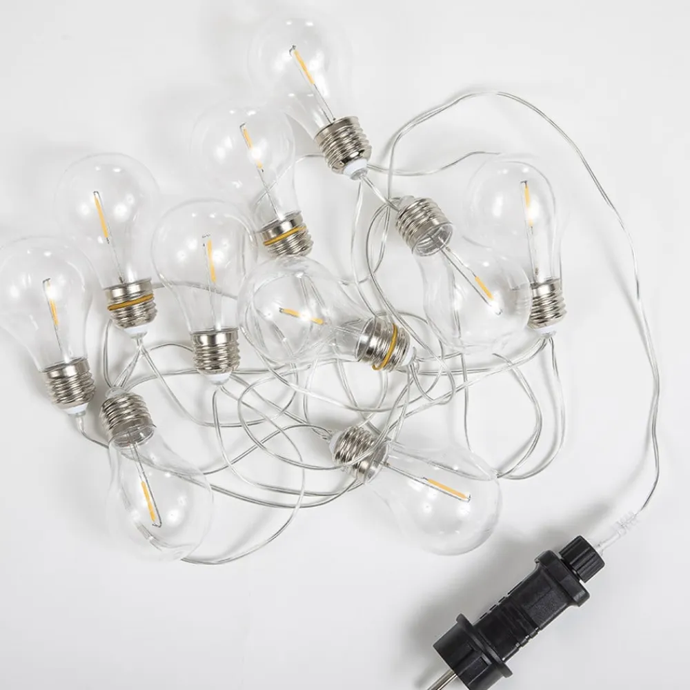LED-lyskæden Stella er ideel til at tilføje et dekorativt element til udendørs områder. De 10 lyskilder har et attraktivt glødelampe-look og skaber en hyggelig atmosfære på altanen, terrassen eller i haven. Lyskæden skinner i et behageligt varmt lys. Belysningselementerne kan ikke udskiftes.