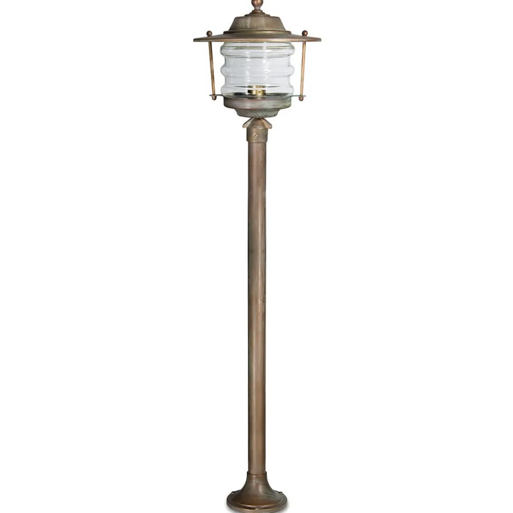 Elegant Adessora-lanterne med en diameter på 26 cm Adessora-lanternen består af en metalramme med en antik messingfinish. Lampeskærmen og toppen er forbundet via to stivere, som hver ender med en lille kugle. Lampen er ideel til at dekorere have- eller ejendomsstier. Den er fremstillet i henhold til IP43-beskyttelsesklasse og beskyttelsesklasse I og er 110 cm høj.