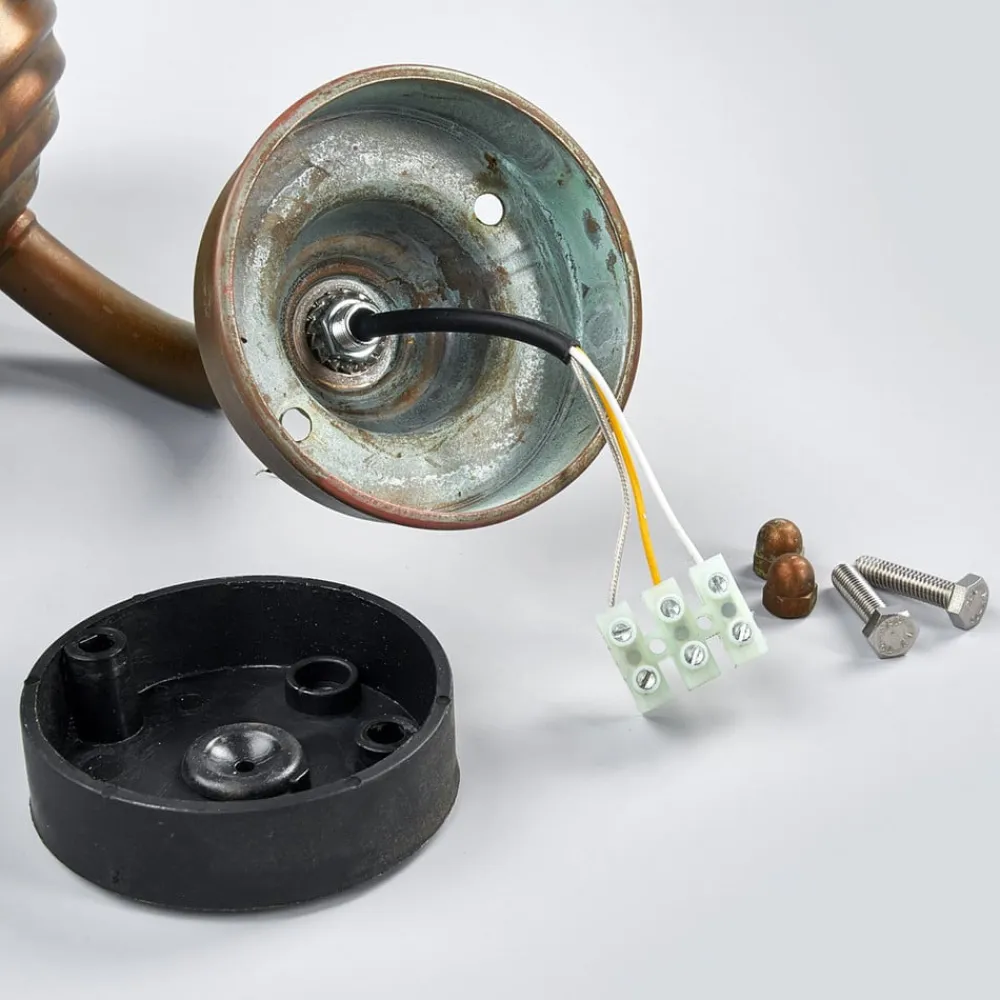 Stilfuld og diskret Antique udendørs væglampeAntique udendørs væglampe har en IP44-beskyttelsesgrad mod indtrængning af støv og vand, hvorfor den optimalt kan bruges udendørs. En stor skærm af messing med en attraktiv kobbergravering kroner glasset, som giver et passende skarpt lys, for eksempel som orienteringslys. Derudover har glasset beskyttende stivere, der gør skader fra stød mindre sandsynlige.