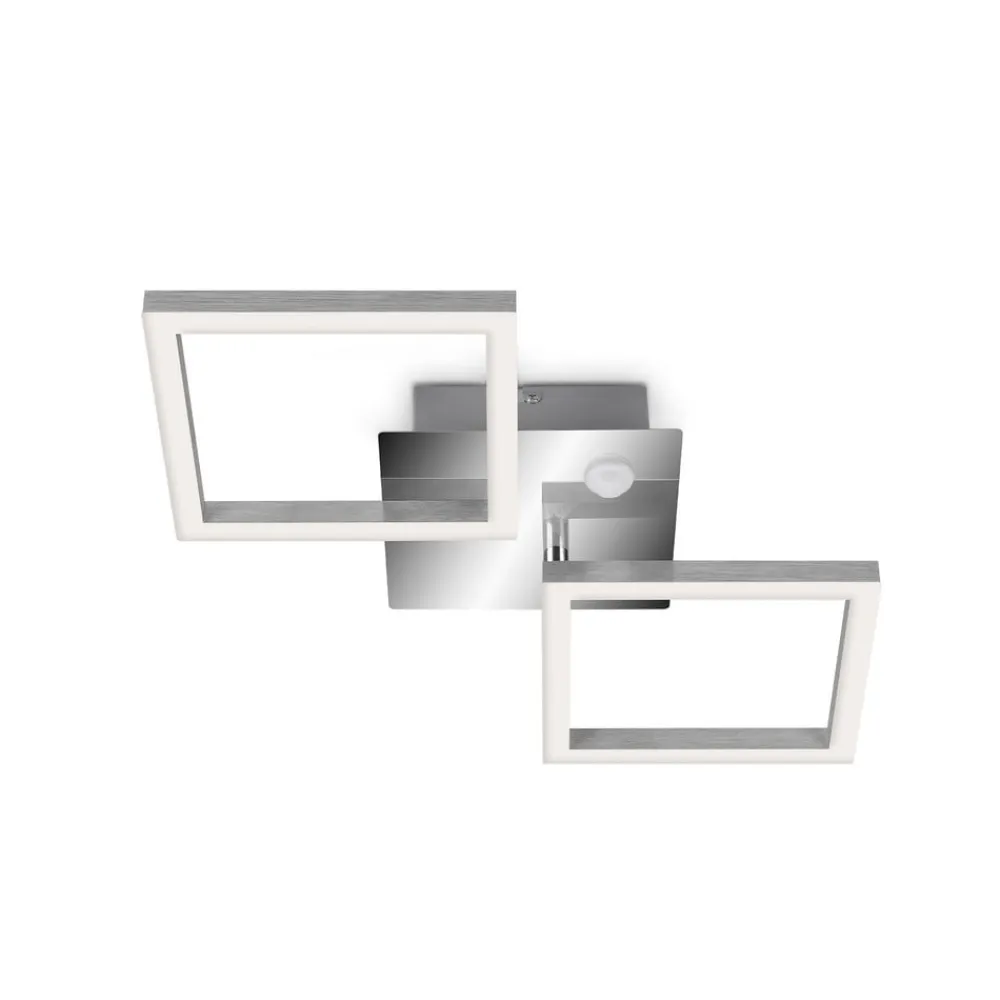 Moderne LED-loftslampe Frame med bevægelsessensor, to flammer, aluminium/kromLoftslampen Frame er en praktisk og fleksibel lyskilde til moderne møblerede opholds- og loungeområder. Loftslampen i aluminium og krom er udstyret med to rektangulære lyselementer, der kan drejes i et vandret plan og huser de varmhvide LED’er på undersiden. Udstyret med bevægelses- og dagslyssensor til automatisk tænding – Lysets varighed kan justeres fra 5 s til 8 min – inkl. kontinuerlig lysfunktion – Detekteringsområde 6 m – Detekteringsvinkel 120° – Skumringstærskel justerbar fra 10 til 2.000 lx