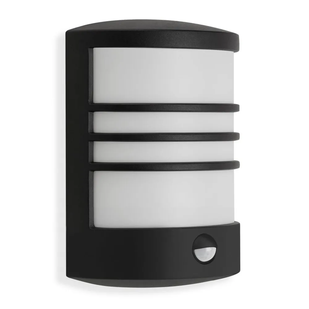 Sort LED udendørs væglampe Toledo i moderne design, udstyret med sensorEn sort halvcylinder lavet af metal danner kroppen på LED udendørs væglampe Toledo. Tre horisontalt løbende stivere underinddeler visuelt den hvide plastdiffusor, som homogent spreder det universelle hvide lys fra de integrerede LED’er. En dagslys- og bevægelsessensor er installeret på forsiden, hvilket muliggør automatisk skift af udendørs vægarmatur efter behov.- Beskyttelsesklasse: IP44- Skumringstærskel justerbar fra 10 til 1.000 lx- Detekteringsvinkel 105°, rækkevidde 10 m- Efterløbstid for bevægelsesdetektering justerbar fra 8 s til 8 min