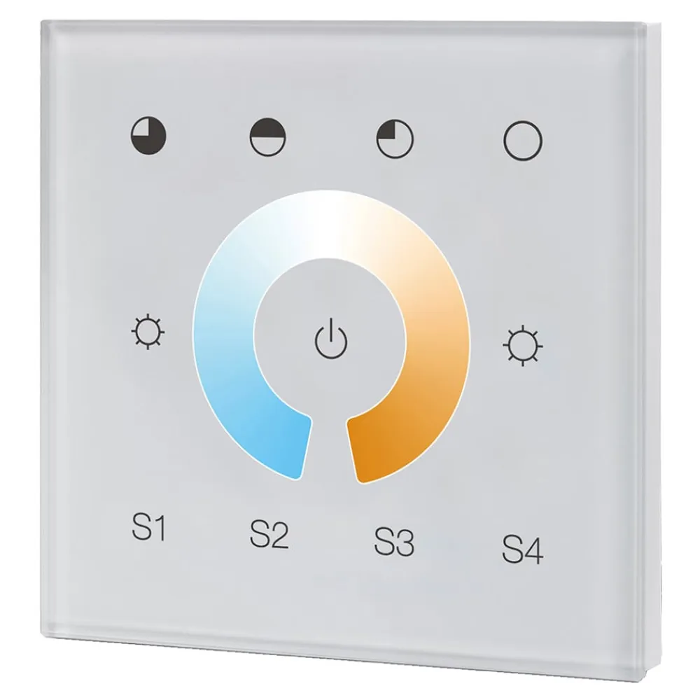 SLC vægmonteret controller til styring af LED’er med dim- og tunable white-funktion Dette firkantede betjeningspanel i glas med touch-overflade er velegnet til styring af armaturer, hvis LED’er kan styres med hensyn til lysudbytte og farvetemperatur i kombination med tilsvarende DALI DT8-betjeningsudstyr (se tilbehør).