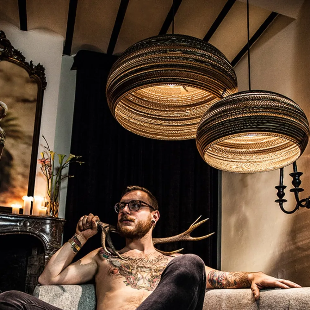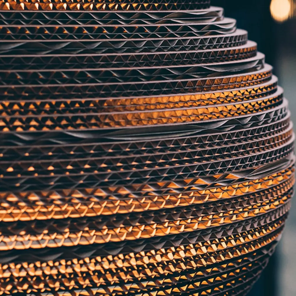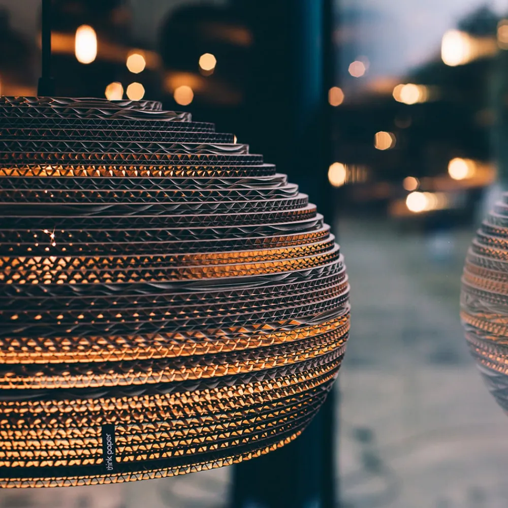 Stor Dandy 640-pendel med skærm af papstrimler Den store Dandy 640-pendel er produceret af Think Paper, en hollandsk producent af designbelysning, der har specialiseret sig i produktion af bæredygtige lamper. Papiret til papskærmene kommer fra ansvarligt forvaltede skove og er, ligesom alle andre anvendte materialer og restprodukter fra produktionen, 100 % genanvendeligt. Den store skærm på Dandy 640-pendlen er lavet af selvbærende papstrimler og limet i hånden med stor håndværksmæssig dygtighed ved hjælp af et rent biologisk nedbrydeligt klæbemiddel. Papstrimlernes mønstre er omhyggeligt arrangeret for at skabe lige, nuancerede snit med en høj kontrastvirkning og en slående lyseffekt. Dandy 640 er en stor pendel, som kan bruges til at oplyse spisebordet eller siddeområdet i stuen og har en meget harmonisk effekt takket være den nuancerede farve. Lidt lys trænger forsigtigt ind gennem de fine mellemrum mellem papstrimlerne, hvilket gør skærmen endnu mere effektiv. Bemærk: Lampen produceres på bestilling; leveringstiden er op til seks uger.