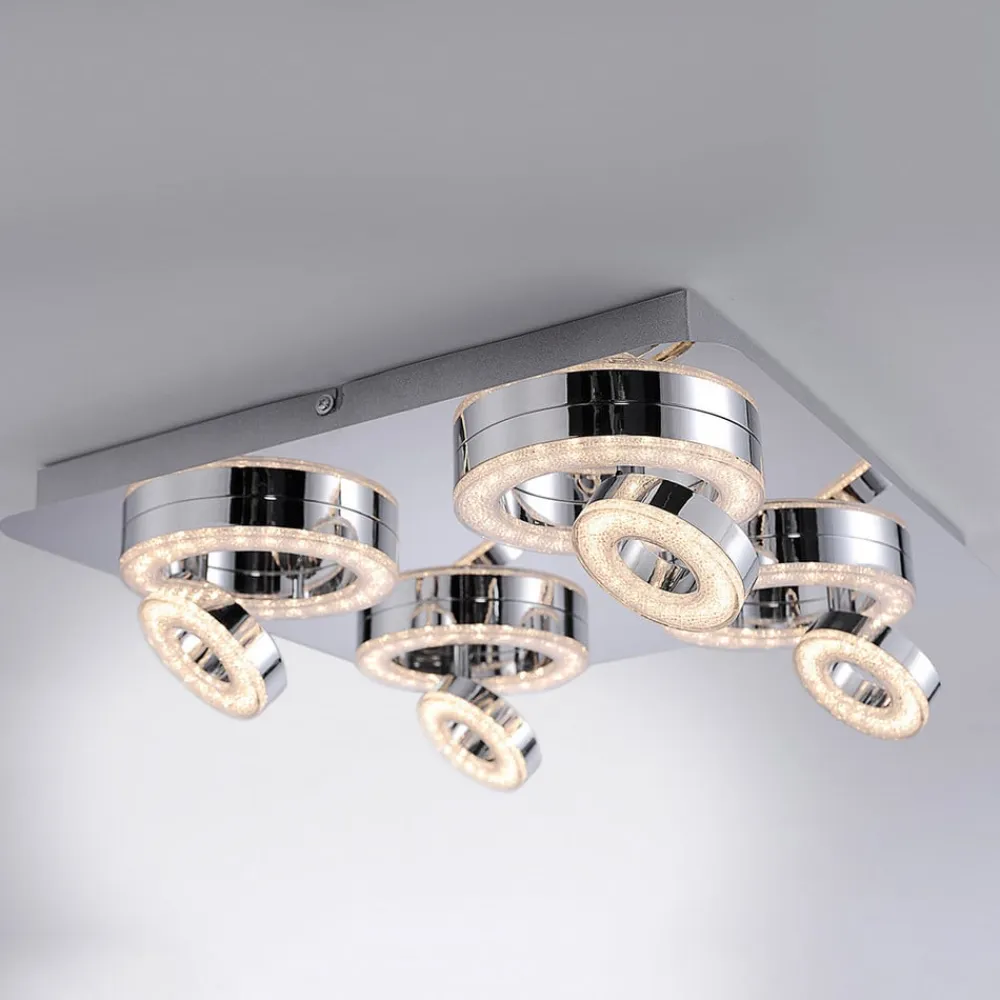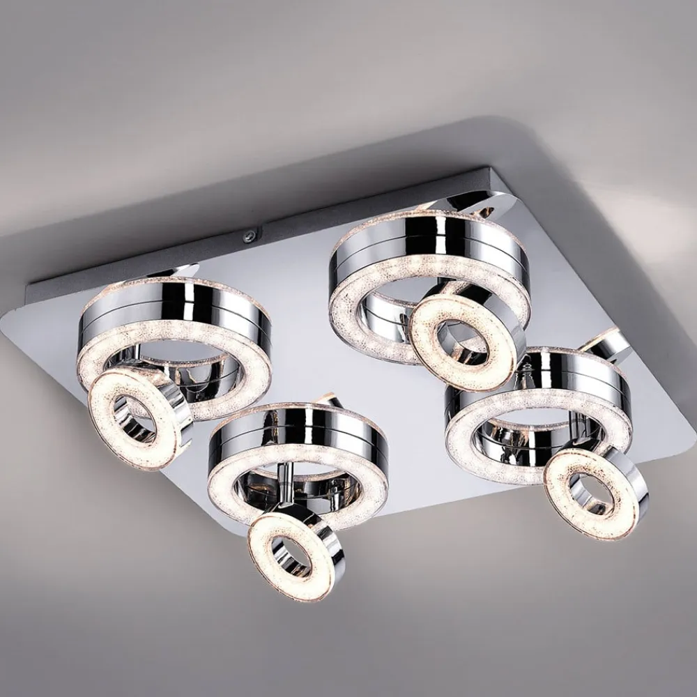 Fire ringformede lyselementer er fastgjort, direkte til den forkromede loftplade, og under dette, er der på beslagene placeret fire små ringe, der gennem leddene kan drejes og svinges. Afdækningerne i ringene, der har integrerede varme hvide lysende LED’er, er fremstillet i akryl, der er designet med et krystal udseende, der funkler i lyset. Den samlede lysstrøm på de otte ringe er 2.280 lumen, hvilket er tilstrækkeligt til generel belysning, selv i store rum.