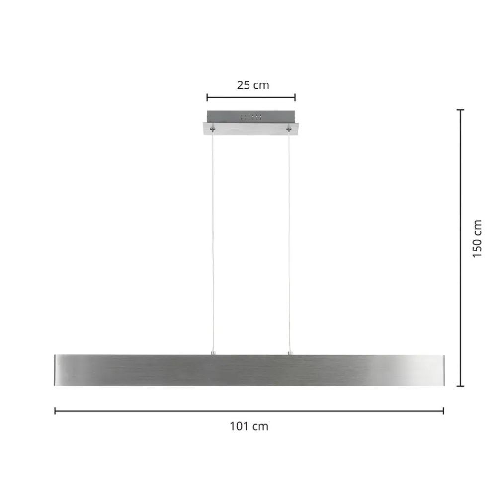 Langstrakt Tinkodara LED-pendellampe i bjælkeform i børstet aluminium – perfekt til en moderne spisestue, dæmpbar i tre trin ved hjælp af vægkontakten Den elegante Tinkodara LED-pendellampe kombinerer funktionel belysning med et tiltalende design. Det varmhvide lys bader dit opholdsrum i en stemningsfuld atmosfære. Med den tretrins dæmpningsfunktion (100 % – 40 % – 10 %) kan du skabe din egen personlige feelgood-atmosfære ved hjælp af en almindelig lyskontakt. Hængelampen imponerer med den sædvanlige Lindby-mærkekvalitet og står derfor for en unik boligoplevelse og enestående design. Den vil finde en plads i din spisestue eller stue. Hængelampen i et moderne design er lavet af aluminium. Tinkodara-modellen imponerer ikke kun med et smukt lysspil, men har også en dekorativ funktion.
