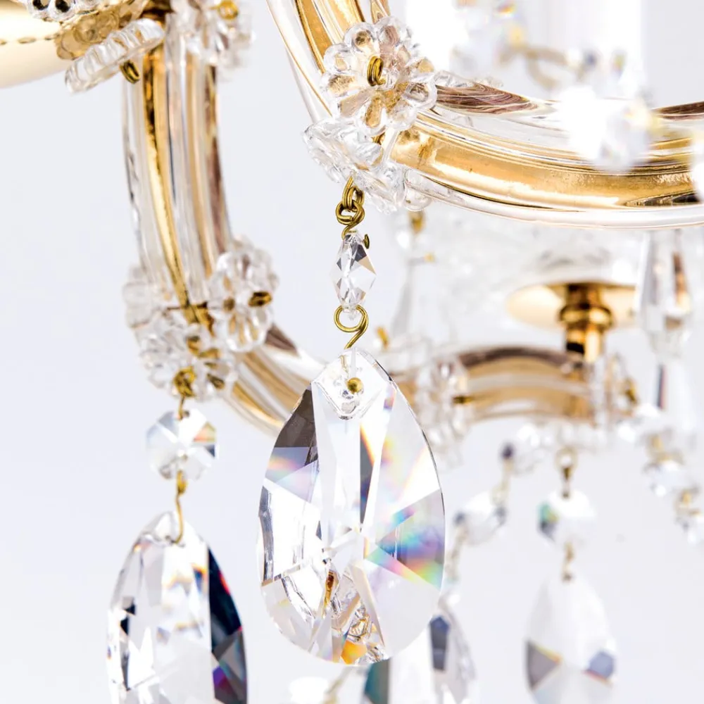 Pragtfuld og klassisk er en rammende beskrivelse af denne lysekrone. TJURA er en klassisk lampe med lyspærer, som ligner stearinlys. Lysekronen er beriget med krystalmanchetter, krystaller med pendelform og krystalkæder. Alle krystallerne er fra Schöler og Swarovski, og metallet er forgyldt med 24 karat guld. Denne lysekrone er af aller højeste kvalitet og har et meget eksklusivt design.
