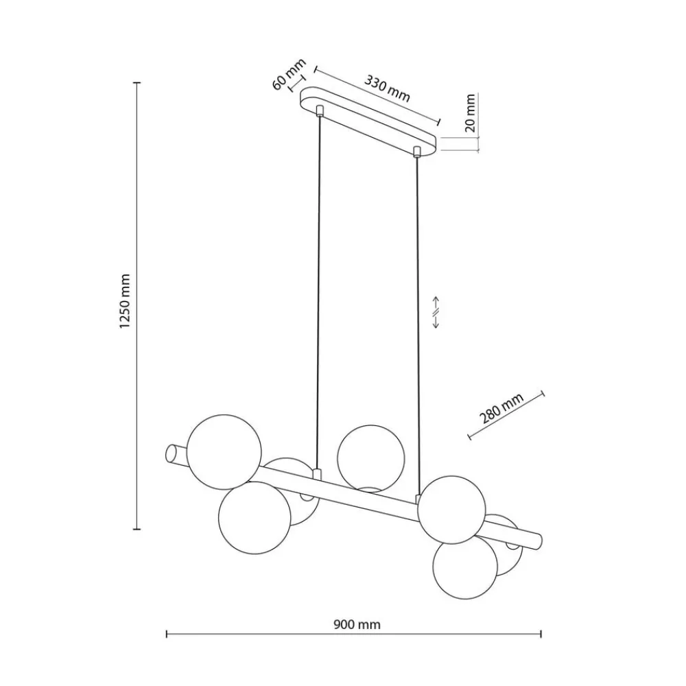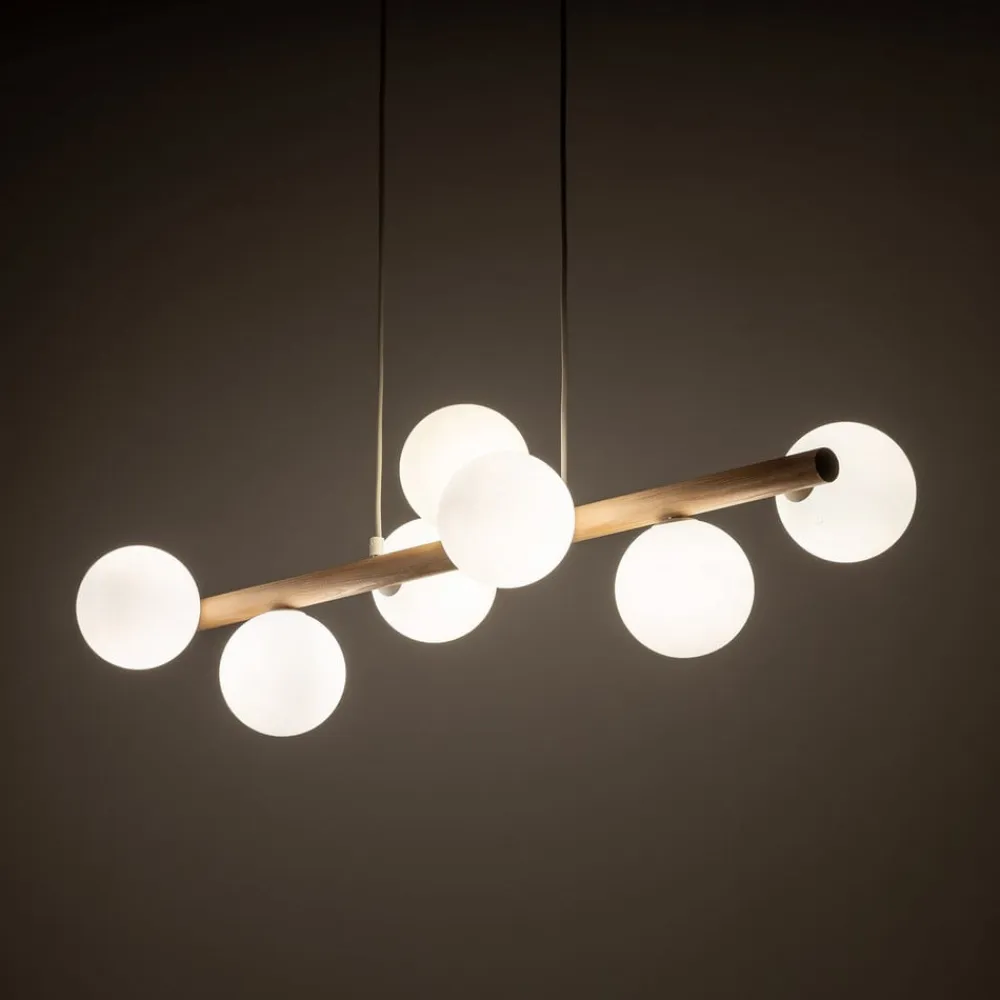 Estera pendel med træbjælke og syv sfæriske opalglasskærme Med sine syv sfæriske opalglasskærme, der hver har en G9-fatning, giver Estera pendel en behagelig belysning til alle sider. Der er også en bjælke af lyst træ og en baldakin af hvidt metal.