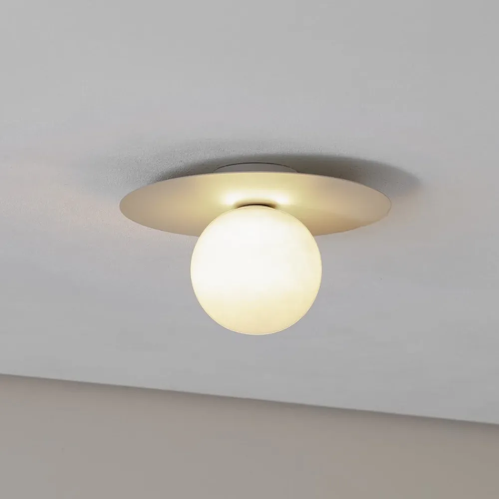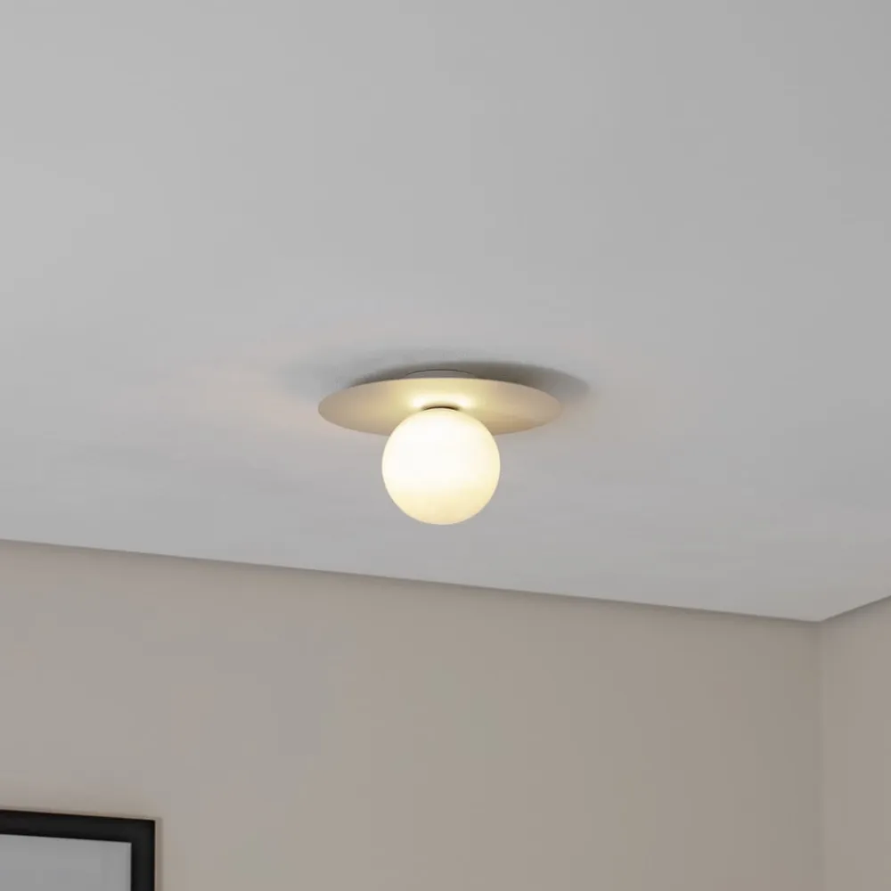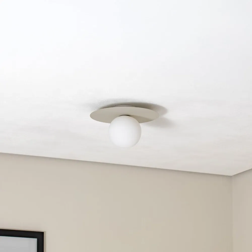 Loftlampen Pixie forener stilfuld elegance med funktionel alsidighed og er et highlight til moderne boliger. Den er fremstillet af højkvalitetsstål og glas og imponerer med sit tidløse design og harmoniske farver i beige og opal. Den kugleformede design med en diameter på 25 cm passer perfekt ind i forskellige rumkoncepter og sikrer en behagelig lysfordeling.