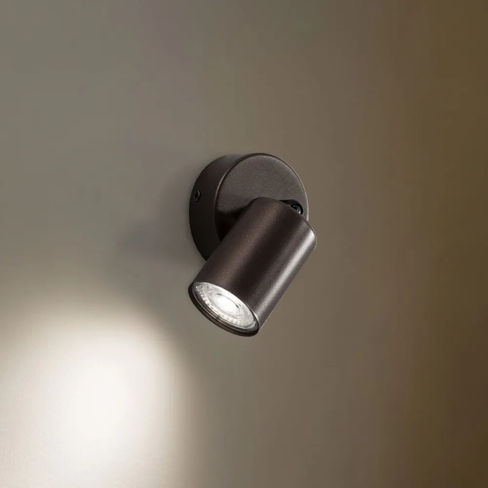 Justerbar Top loftspot med cylindrisk hoved GU10 Top loftspot lavet af stål i en mat mørkebrun finish består af en rund baldakin og et cylindrisk spotlighthoved. Sidstnævnte kan justeres, så lyset kan rettes mod det ønskede område.
