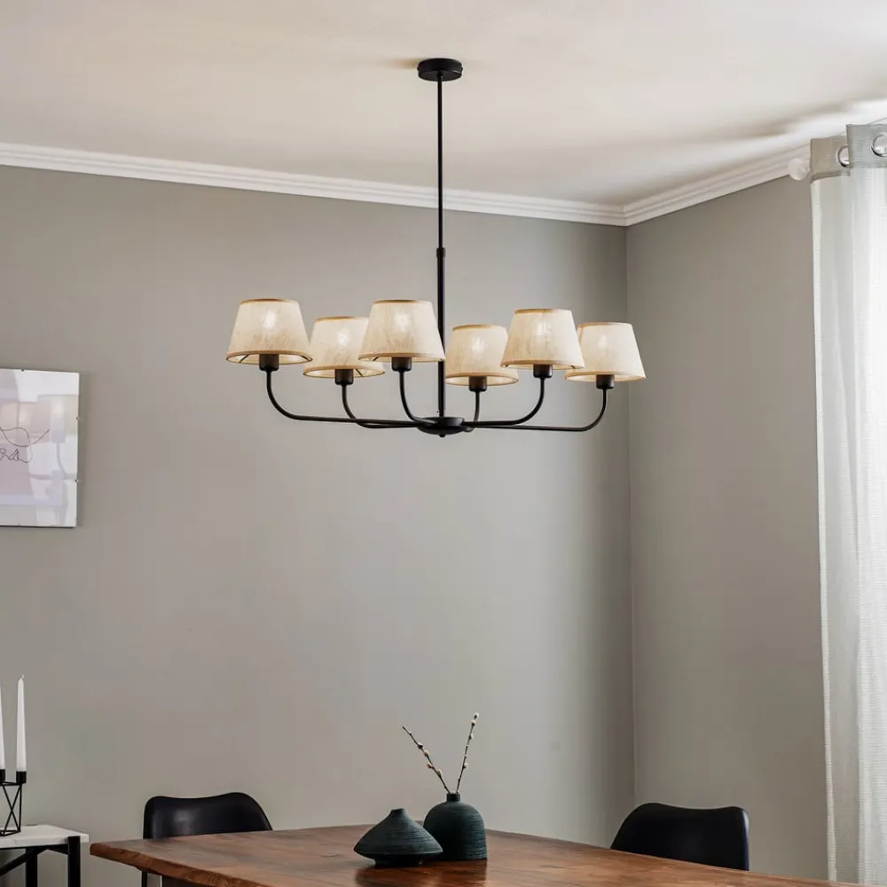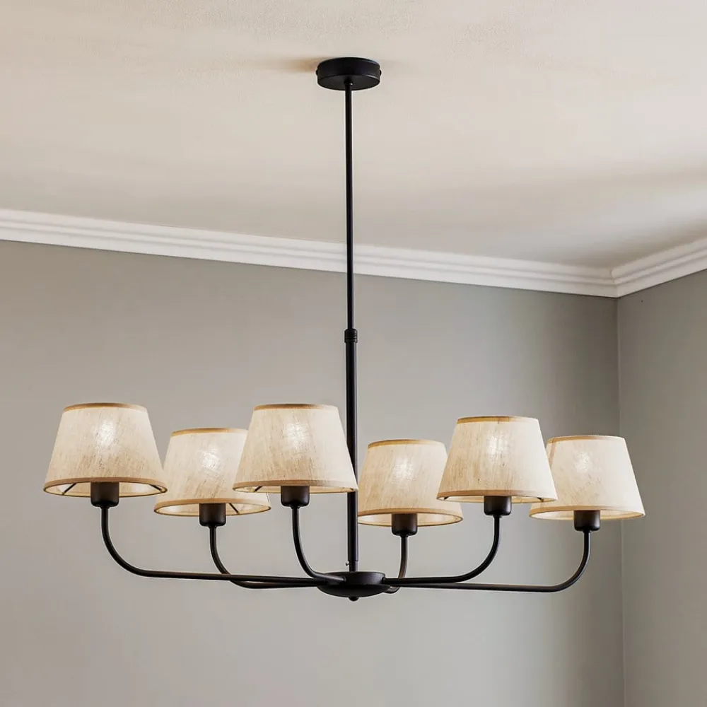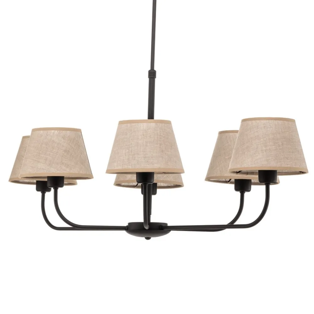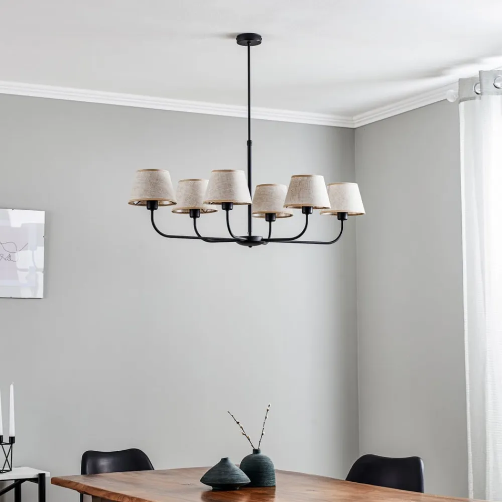 Lysekrone Chicago, udstyret med seks linnedskærme, forener tidløs elegance med høj kvalitet. Fremstillet af en harmonisk kombination af metal, linned og plast, udstråler den i farverne sort og natur en diskret raffinement. Denne lysekrone er ikke kun et belysningsobjekt, men også et statement for stilfuldt boligindretning. Dens tilstedeværelse i stuen eller spisestuen skaber en atmosfære, der indbyder til både afslapning og hyggeligt samvær.
