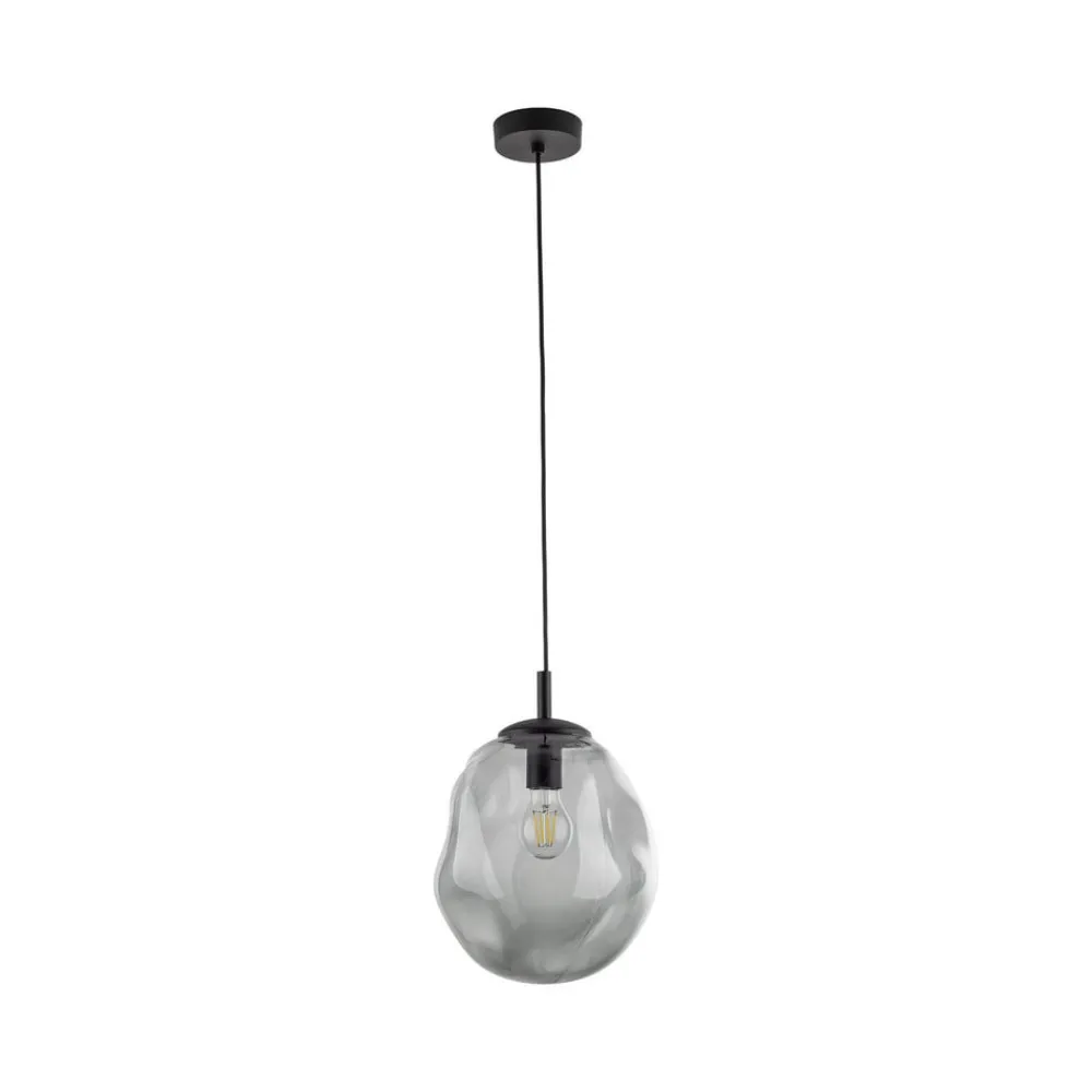 Sol Mini pendel med grafitgrå tonet græsskærm og sort ophæng Sol Mini pendel med ét lys er et blikfang i moderne stuer og lounges. Det sorte ophæng med rund baldakin holder en rund, uregelmæssigt bølget glasskærm. Den er transparent grafitgrå og giver udsyn til den lyskilde, der skal bruges.