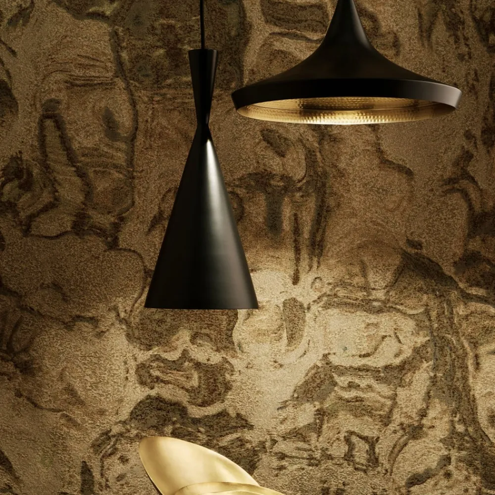 Håndlavet Beat Tall LED-pendellampe af messing Den smalle lampeskærm på Beat Tall LED-pendellampen, som minder om et timeglas, er lavet af massiv messingplade. Den er fremstillet af håndværksmestre i Indien ved hjælp af traditionelt messinghåndværk. Den håndslåede inderside af skærmen skaber ikke kun en smuk lyseffekt, hver lampe bærer også håndværkerens signatur og er unik. Den slanke form og nedadrettede lysfordeling gør armaturet til den ideelle lyskilde over et lille sidebord. Beat-projektet – og dermed produktionen af lampeserien med samme navn – begyndte i 2004, da Tom Dixon var involveret i et initiativ i Jaipur i Indien, som havde til formål at give det svindende antal håndværkere i regionen et perspektiv. Siden da er lampeskærmene i Beat-serien blevet fremstillet i hånden i Moradabad i det nordlige Indien, hvor de er blevet braiseret og banket på indersiden i hånden. Det gør hvert stykke unikt. Det kan tage op til fire dage at færdiggøre en lampeskærm.