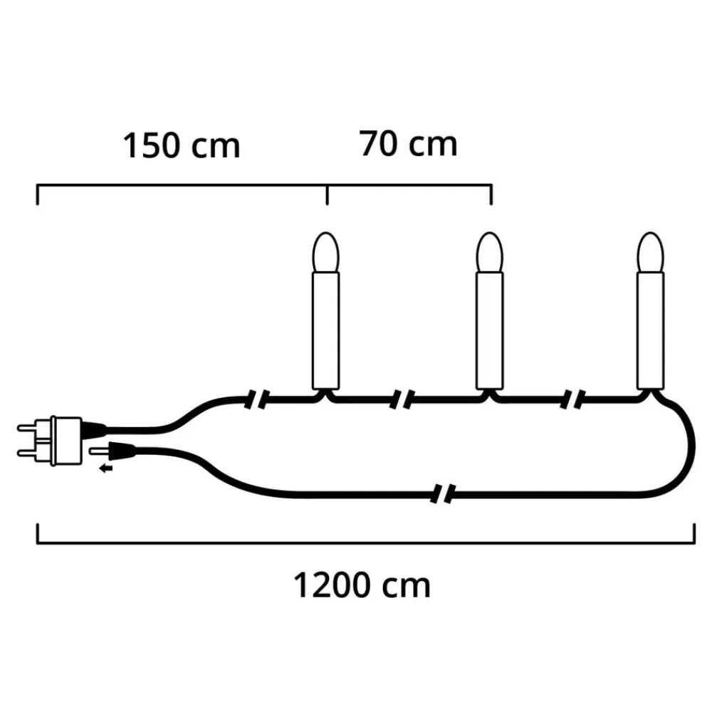Samlet længde 1200 cm, forsyningsledning 150 cm, lysafstand 70 cm