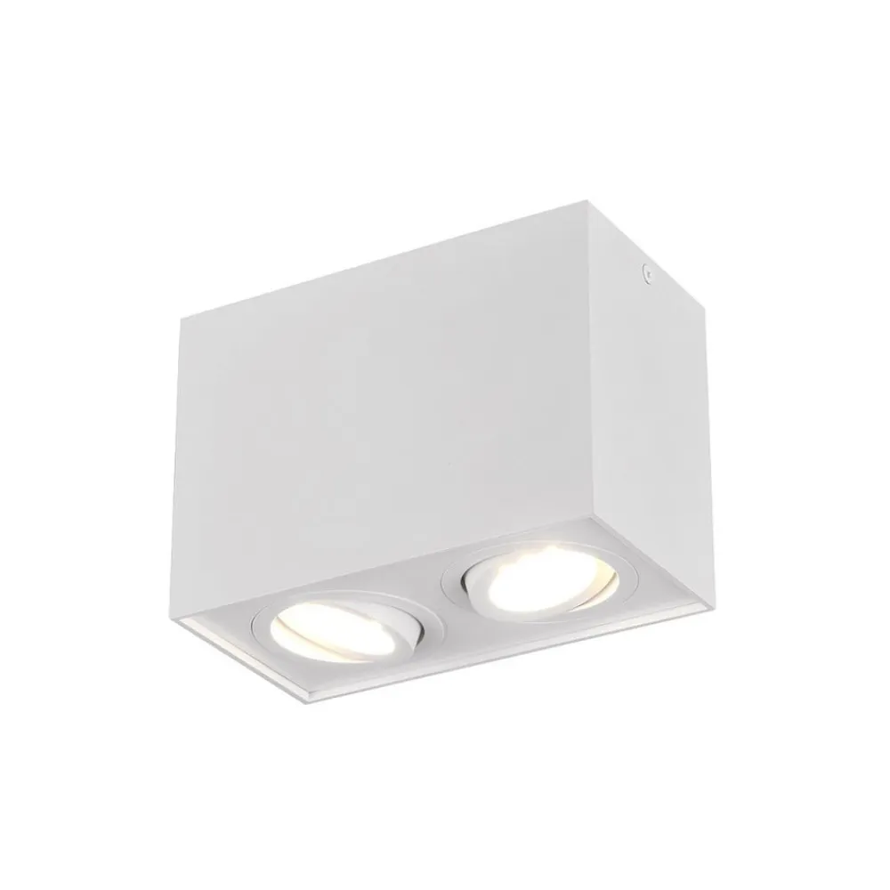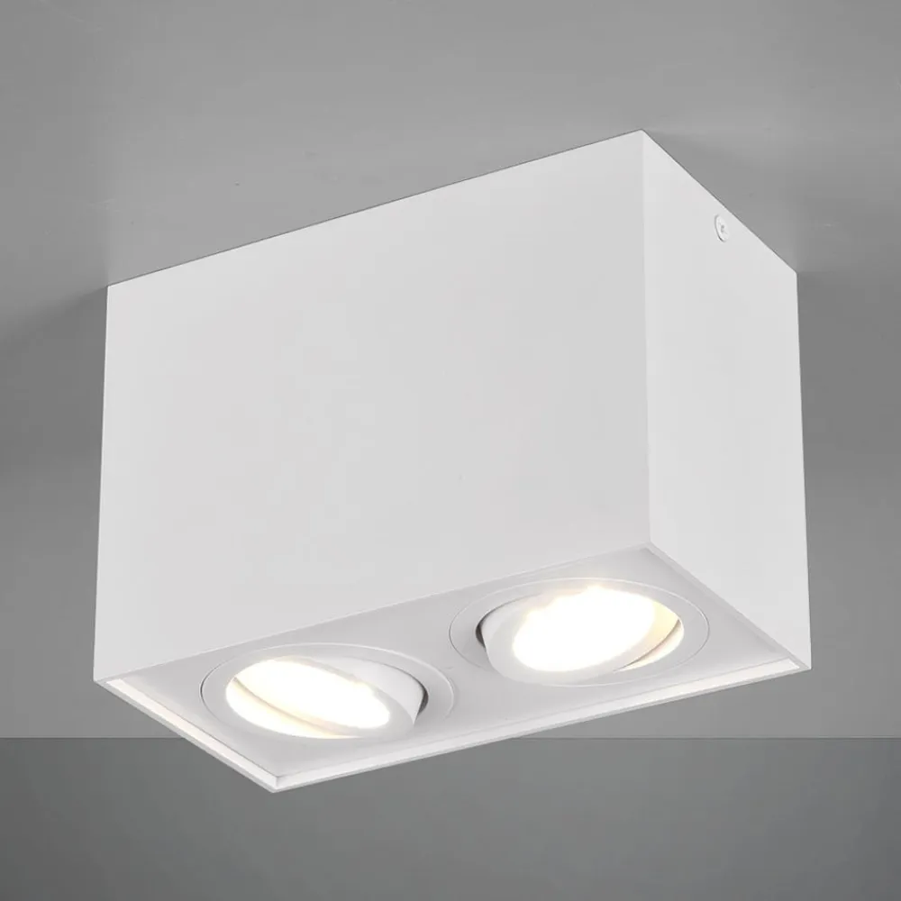Loftlampen Biscuit har en firkantet form og er tilsvarende enkel. Den hvide ses næsten ikke mod det hvide loft, så man får ikke øje på spotlighten med 2 lyskilder med det samme.