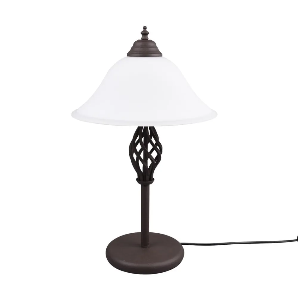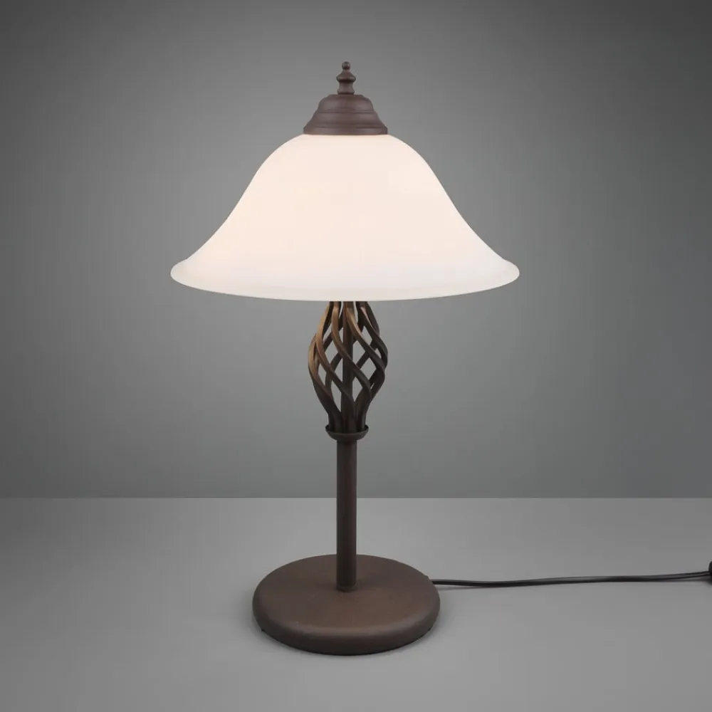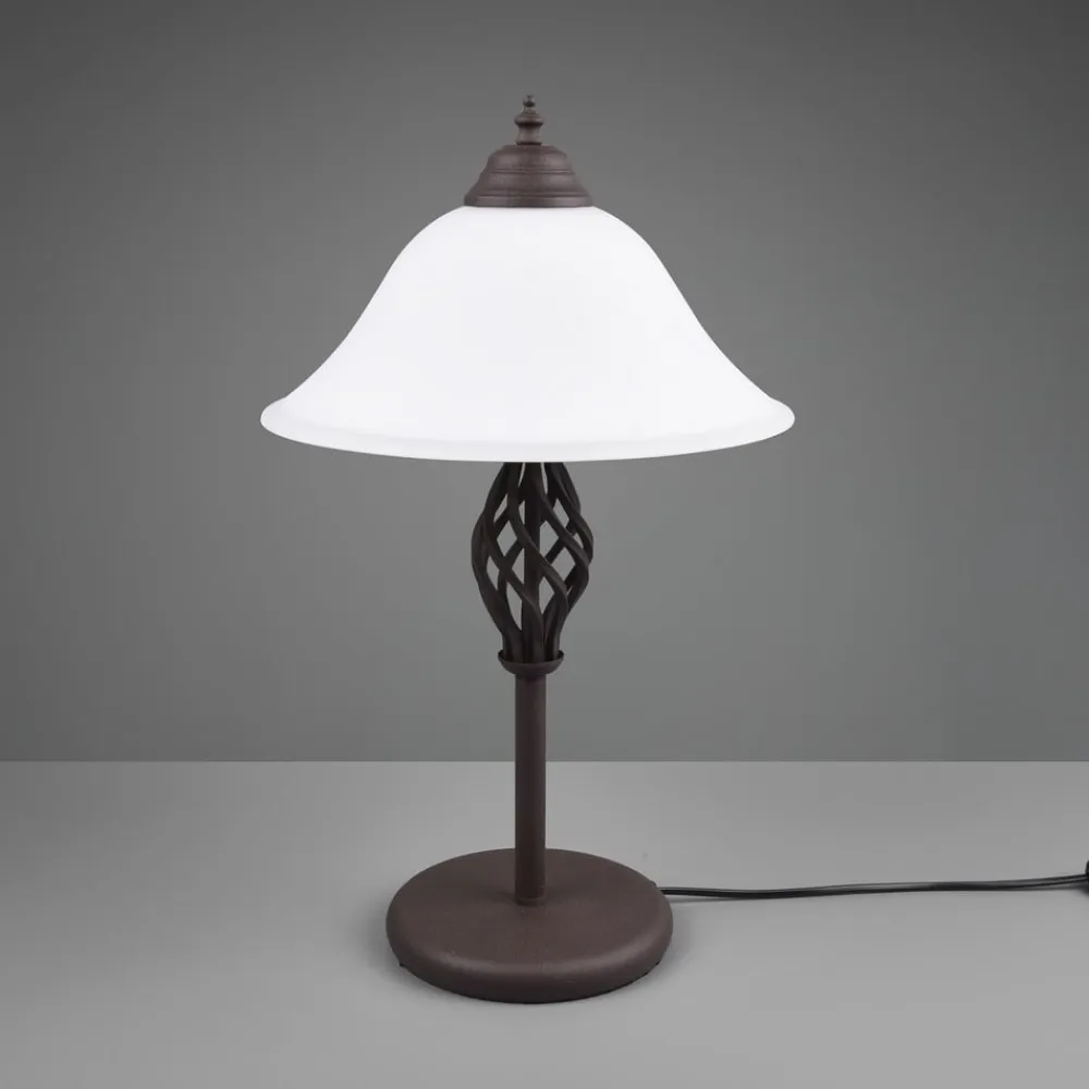 Rustica-bordlampen består af rustfarvet metal og en skærm af hvidt glas, som har plads til to E14-pærer. Lampen er velegnet som et dekorativt blikfang i stuen, men kan også bruges som lyskilde på f.eks. kontoret eller som læselampe i soveværelset. På grund af sit særlige design passer bordlampen perfekt ind i antikke, rustikke eller landlige stuer. Lampen betjenes via den integrerede ledningskontakt.
