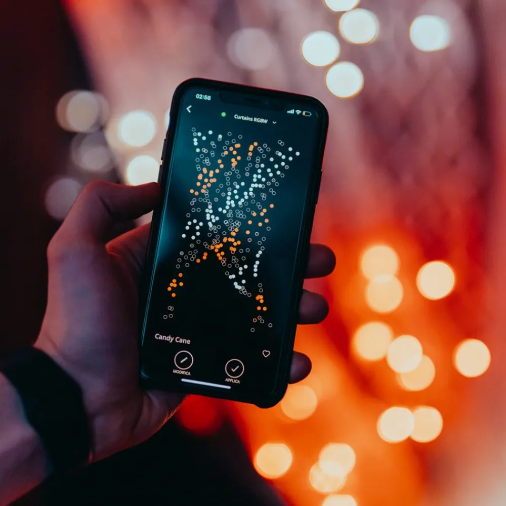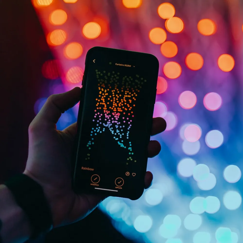 LED-lysgardin Twinkly RGBW – smart styrbart lysshow til indendørs og udendørs Farverig effektbelysning overalt takket være sit eget mini-WiFi- og Bluetooth-modul, der nemt kan styres via app, stemmestyring eller endda manuelt – intet problem takket være Twinkly. LED-lystæppet, som lyser i farver og hvidt afhængigt af indstillingen, består af ti tråde, hver 210 cm høje og placeret ved siden af hinanden, som kan lyse i enhver farve, mønster og rækkefølge for at skabe et spændende lyshav. Der findes allerede forudkonfigurerede programmer i Twinkly-appen, som kan forfines yderligere, hvis det er nødvendigt. Appen tildeler også hver LED, der er optaget af smartphone-kameraet, rumligt, så brugerne frit kan skabe deres egne lyskompositioner ved hjælp af farve, lysstyrke, mønster, rotation og ændringshastighed. De fabriksdefinerede mønstre og ændringer kan også vælges, og lysgardinet kan tændes med den medfølgende controller. Hvis flere lysgardiner eller andre twinkly-elementer skal styres og grupperes, kan den cloudbaserede webapplikation, der er udviklet til dette formål, bruges.