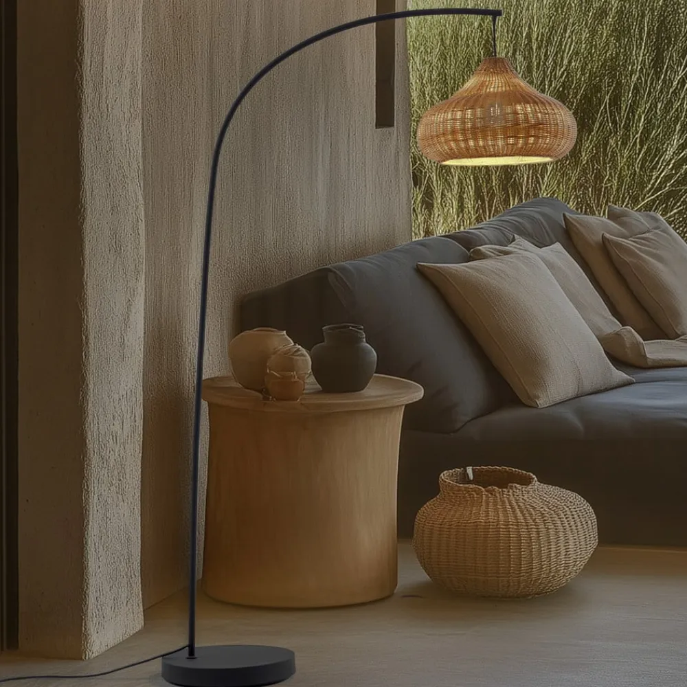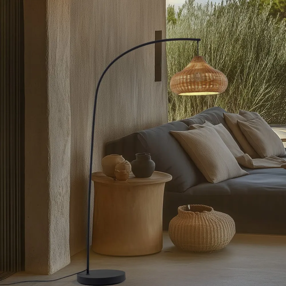 Perfekt til terrassen – udendørs gulvlampe Taniola af rattan og jern med landhusflair Oplev den stilfulde udendørs gulvlampe Taniola, som ikke kun er et visuelt HighLight til terrasser og balkoner med sin flettede rattanskærm og robuste jernkonstruktion, men også imponerer med sin kapslingsgrad på IP44. Kombinationen af beige og sort passer harmonisk ind i den rustikke landhusstemning og skaber en atmosfære, der både kan virke beroligende og energigivende. Med den udendørs gulvlampe Taniola bliver lyset et fascinerende designelement i dit udendørs område.