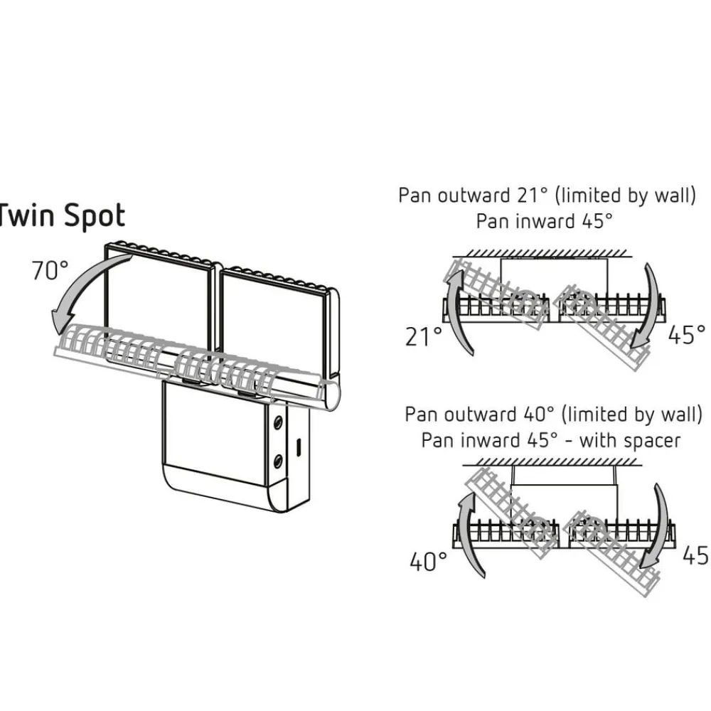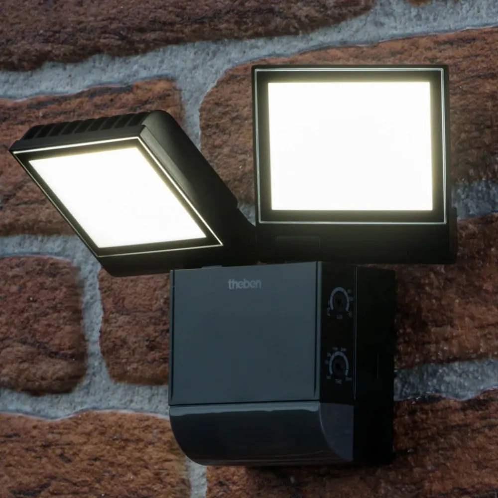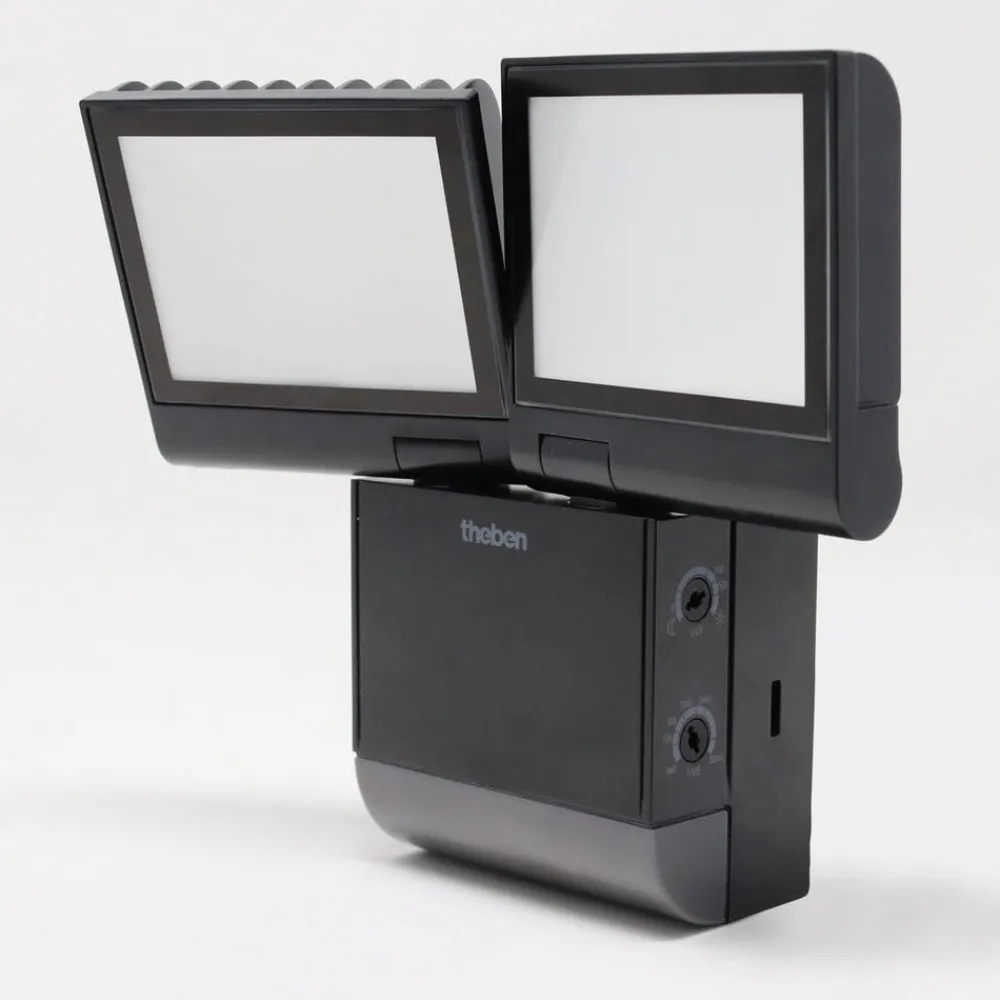 Theben theLeda S17-100 er en formskøn, trådnetværkskompatibel LED-spotlight til udendørs brug med integreret bevægelsessensor og to drejelige og vipbare LED-paneler (kan drejes vandret ± 20/45° og vippes 70° nedad).
