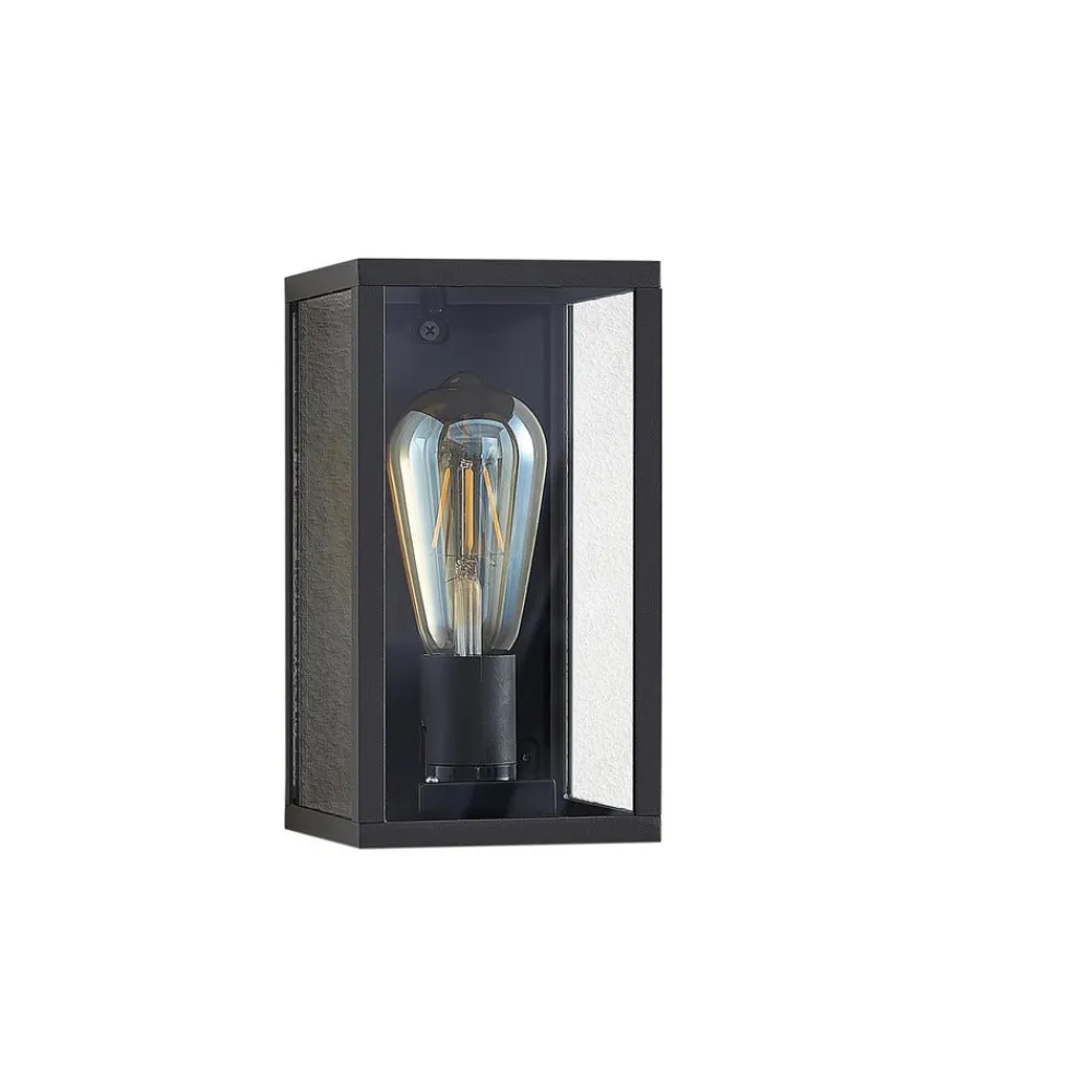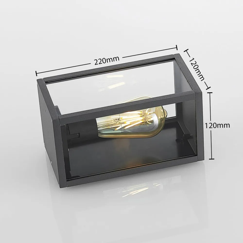 Kasseformet Filimon udendørs væglampe med mørkegråt aluminiumshus og glasindsatser Filimon er ideel til belysning af en udendørs facade takket være kapslingsgraden på IP44. Lampens form ligner en lygte eller endda en kasse på en moderne måde. Der er dog ingen legende kurver her, i stedet dominerer en lineær form udseendet. Huset er lavet af aluminium med en mørkegrå finish og suppleres af indsatser i klart glas. Det klare glas afslører naturligvis pæren, så den skal vælges med omhu, så den passer godt ind i det samlede look. Det anbefales derfor at bruge glødepærer eller rustikke pærer, som ser lige så nostalgiske ud som klassiske glødepærer.