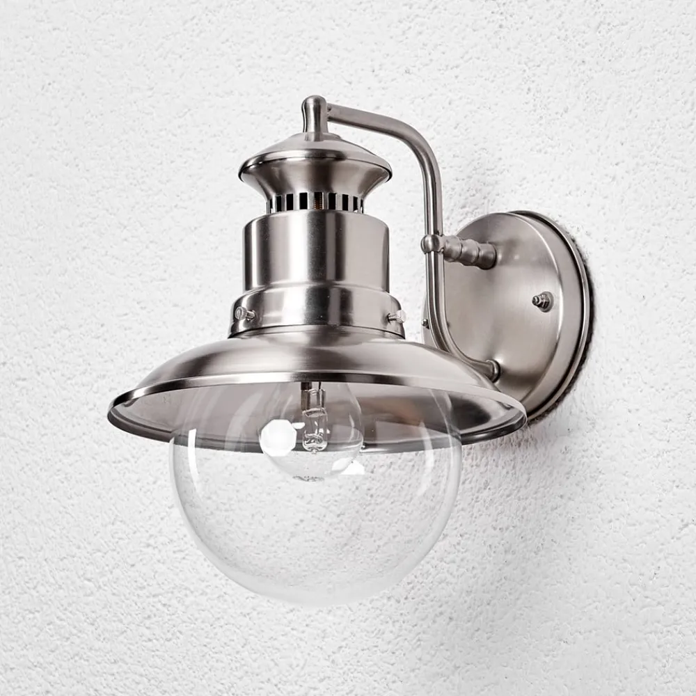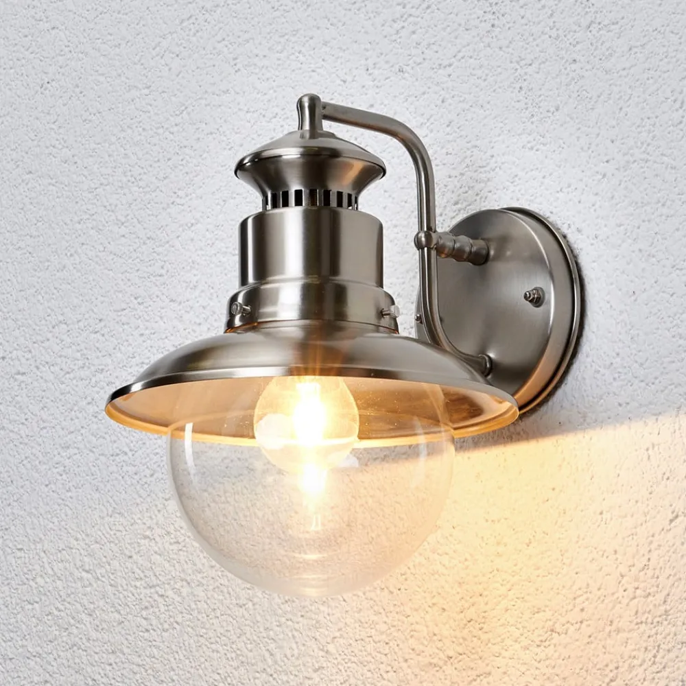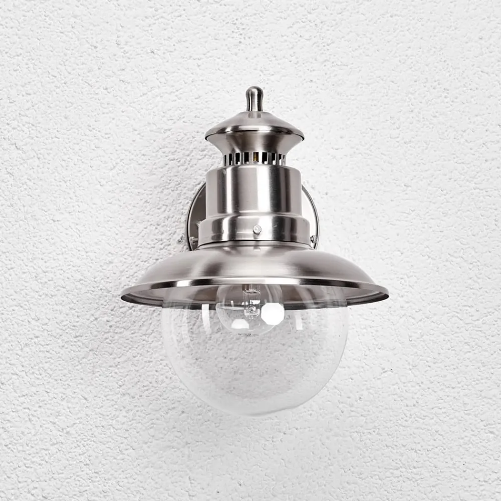 Moderne eller antik? Udendørs væglampe Gwendolyn forener begge stilarter: Den rustfri ståloverflade giver lampen et moderne udtryk, mens de afrundede former har et nostalgisk præg, der minder om klassiske lygter fra fortiden. Da væglamperne er udstyret med en E27-fatning, kan man bruge alle typer pærer, for både glødepærer og halogenpærer samt de mere strømbesparende energisparepærer og LED-pærer er så at sige standard, som man kan vælge imellem.