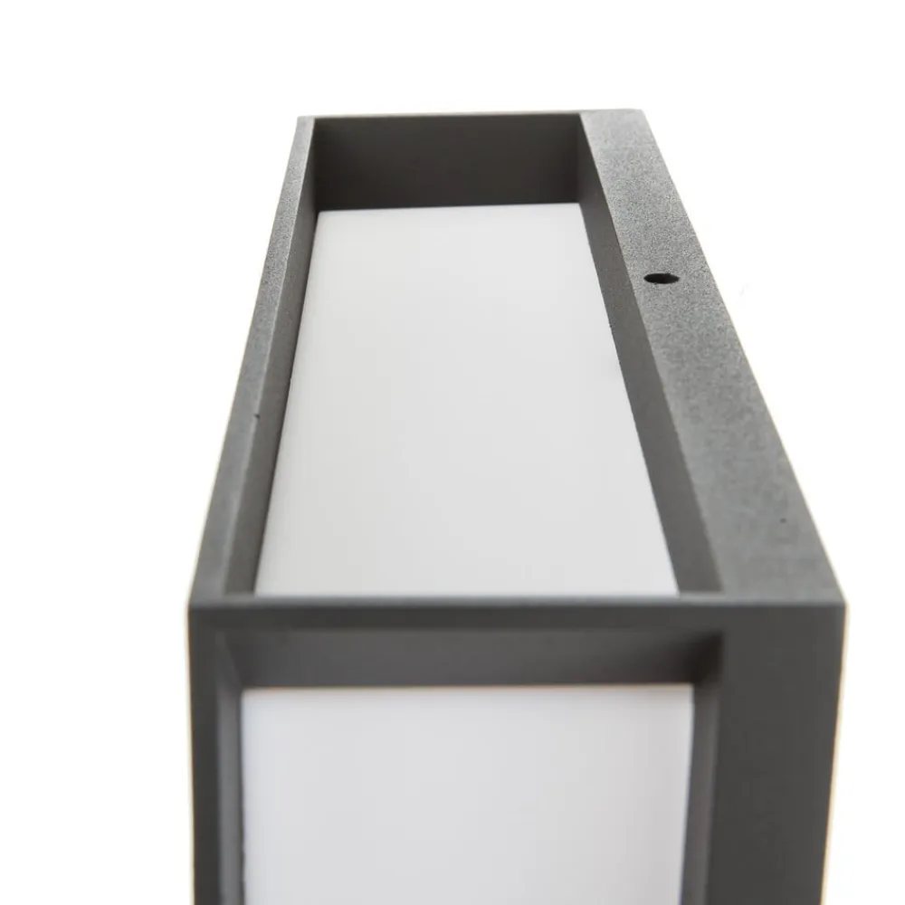 Henry firkantet udendørs væglampe, IP44 Henry udendørs væglampe udsender lys til alle sider takket være den store, opalhvide skærm. Den antracitfarvede aluminiumsramme indrammer stilfuldt lampeskærmen og giver en vellykket farvekontrast. Henry kan ikke kun bruges som væglampe, men også som loftslampe for at give en tidløs almenbelysning i udendørs områder. Udendørslampen er udstyret med to E27-pærer.