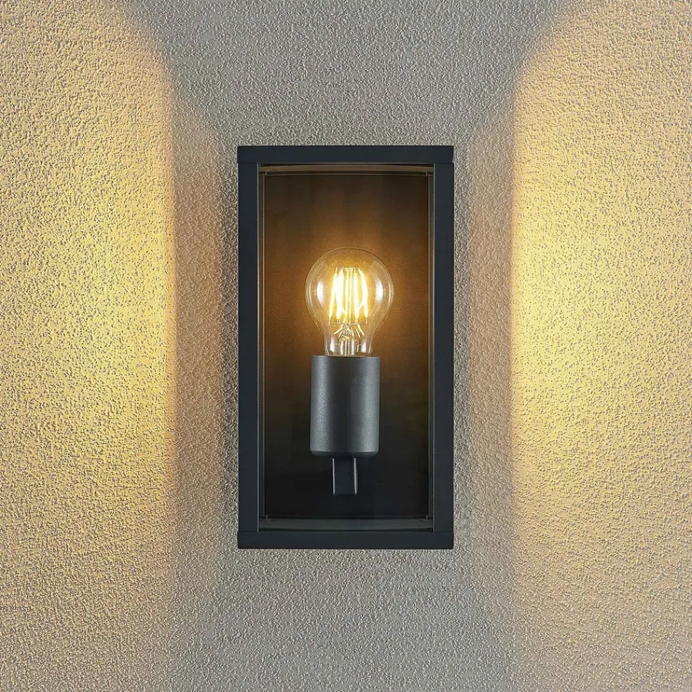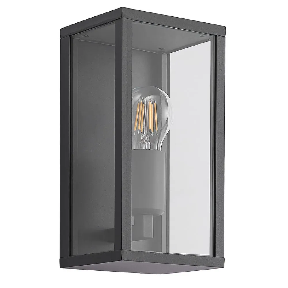 Peldar udendørs væglampe til belysning af terrasser og indgange Den mørkegrå Peldar udendørs væglampe imponerer med sine klart definerede former og sit markante udseende. Huset har en rektangulær form og er lavet af aluminium. Lampeskærmen er lavet af glas og giver derfor et klart udsyn til lyskilden. Af denne grund skal den lyskilde, der skal bruges, vælges med omhu. Energibesparende LED-pærer med et trendy glødetrådslook eller et nostalgisk rustikt look er ideelle her.