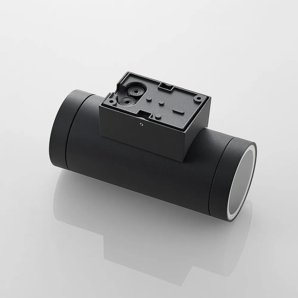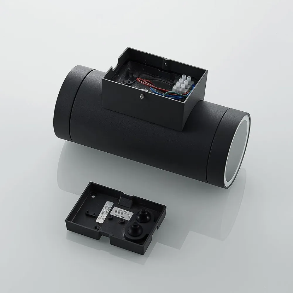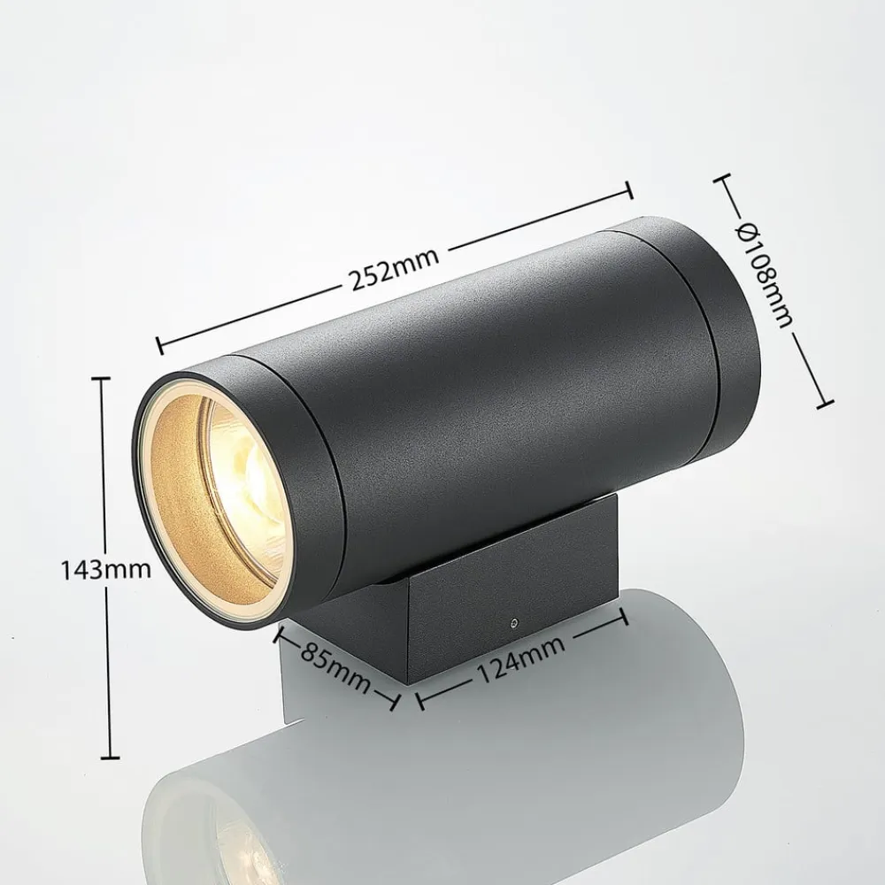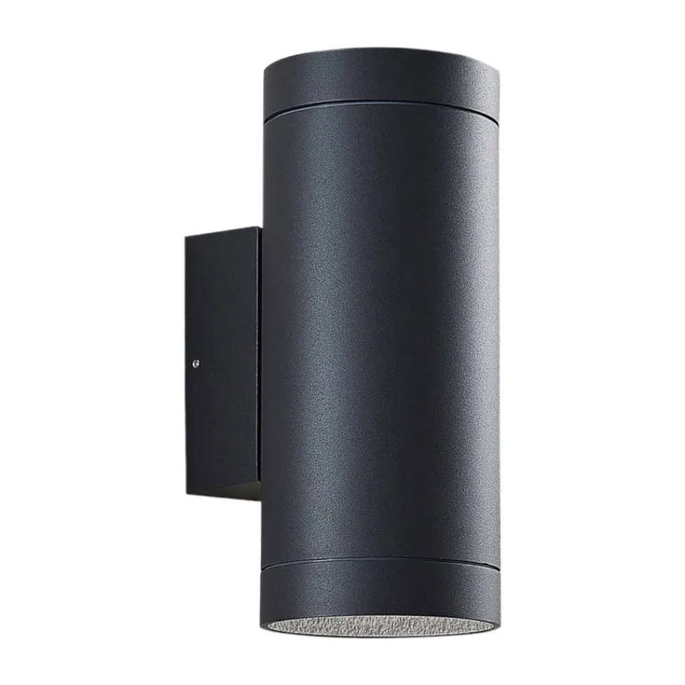 Cylindrisk udendørs væglampe Thomke med mørkegrå finish, IP65 Denne udendørs væglampe imponerer med sit 2 lyskilder design og opadgående og nedadgående lysudslip. Den ser meget effektiv ud udendørs, selv på afstand. Konventionelle LED-pærer kan bruges, helst med effektiv LED-teknologi. Lampekroppen er lavet af trykstøbt aluminium og har en mørkegrå overflade, der ligesom den cylindriske form er så tidløs, at armaturet er særligt alsidigt. Den høje kapslingsgrad giver optimal beskyttelse mod fugt og snavs – IK06 slagfasthedsklasse – Gennemgående ledninger er mulige