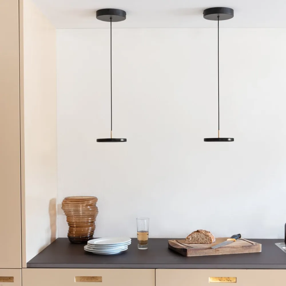 Puristisk LED pendelarmatur Asteria Micro V2, dæmpbarAsteria Micro er et diskret pendelarmatur med små dimensioner, der er perfekt til belysning af en disk eller et bord, især når det kombineres i flere. Den kombinerer et moderne design, moderne teknologi og traditionelt håndværk og kan integreres i mange indretningsstile og rum takket være det slanke, minimalistiske design. Skærmen har et meget fladt design og er fremstillet af aluminium af høj kvalitet. Den er udstyret med varmt hvide LED’er, hvis lys skinner jævnt og blændfrit nedad gennem et dæksel af akryl. Mellem skærm og kabel sidder et messingfarvet element, der skaber en elegant og klar overgang mellem de to komponenter og skaber en detalje, der harmonisk afrunder det samlede udseende.- dæmpbar med ekstern lysdæmperLED-pendellampen Asteria Micro V2 fra UMAGE er et design af Søren Ravn Christensen, medstifter af belysningsvirksomheden UMAGE. En puristisk stil og en toneangivende belysningsteknologi kendetegner virksomhedens armaturer og gør dem til alsidige lysobjekter med en helt særlig flair, som beriger de mest forskellige indretningsstile. UMAGE-mærket, der har base i København, har til formål at kombinere den enkle, funktionelle skandinaviske stil med håndværk og moderne teknologi, samtidig med at der fortsat er fokus på en miljøbevidst tilgang til naturen.