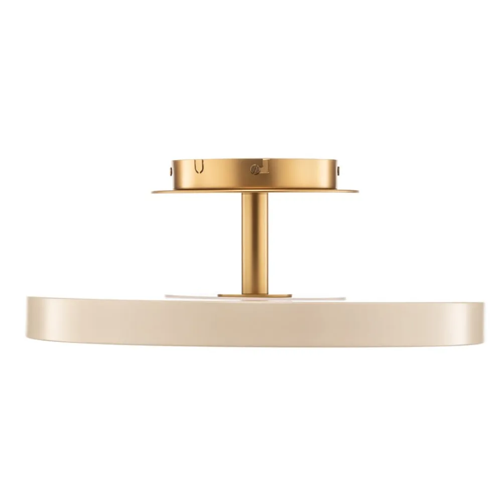 Den skiveformede krop på loftarmaturet Asteria Up Medium fra UMAGE giver både kraftig belysning nedad og et atmosfærisk lys, der sendes opad mod loftet, og som virkelig kan komme til sin ret takket være den afstand, armaturet er fra loftet.