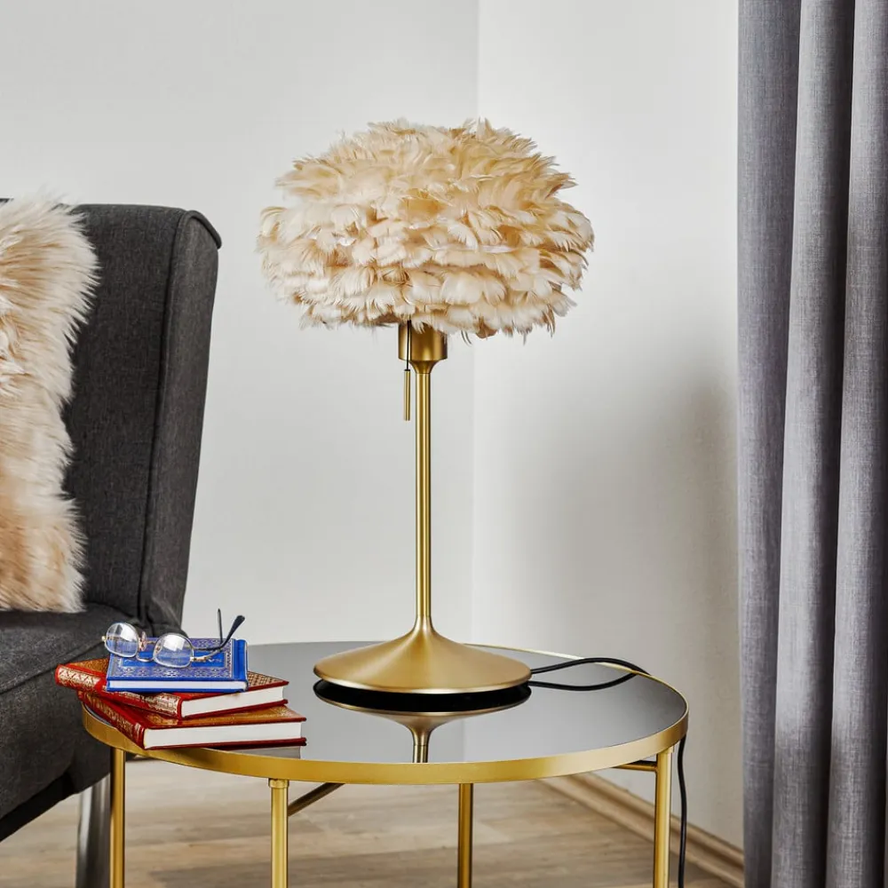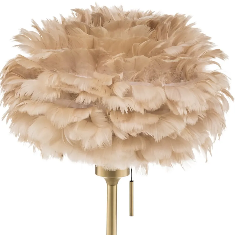 Bordlampe Eos mini med skærm i brun fjerkjole og stativ i messing