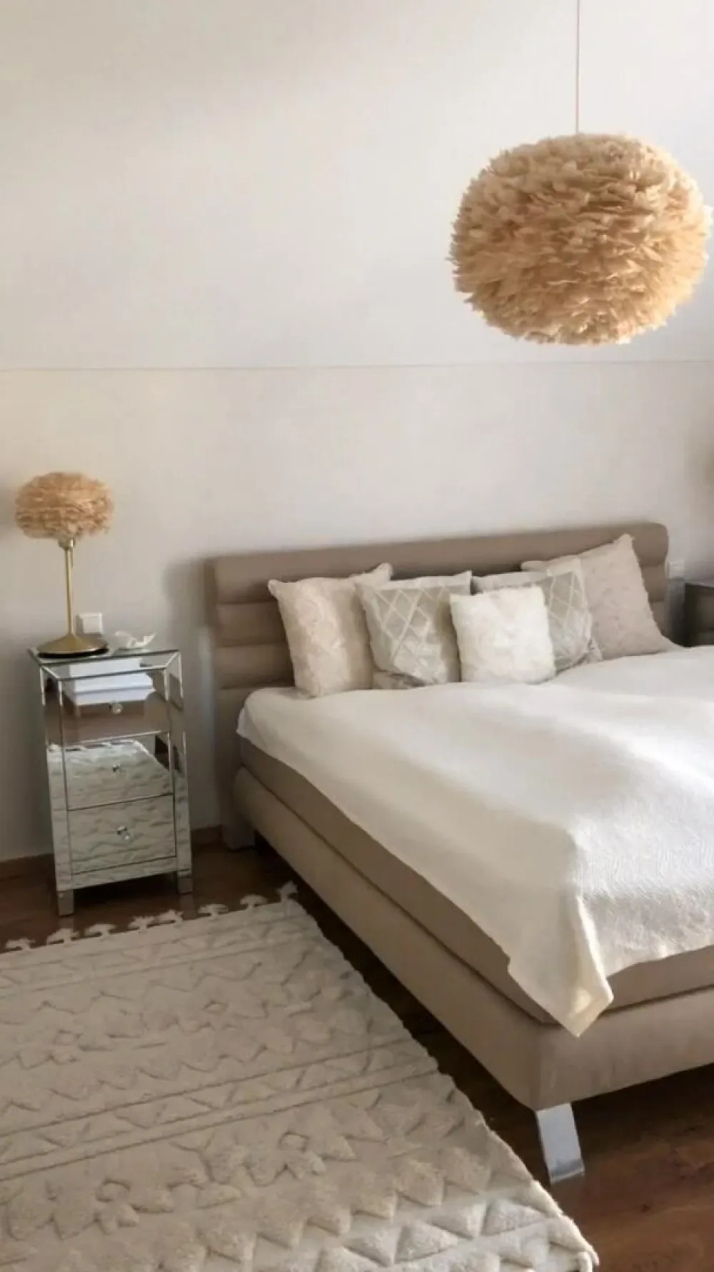 Varme farver giver Eos mini en hyggelig atmosfære. På grund af fjenes stærkt dæmpende effekt bidrager det fremkommende lys også til dette. Desuden går et strejf af lethed hånd i hånd med skyggens fjerbesætning, som er underbygget af den elegante standers slanke stang.