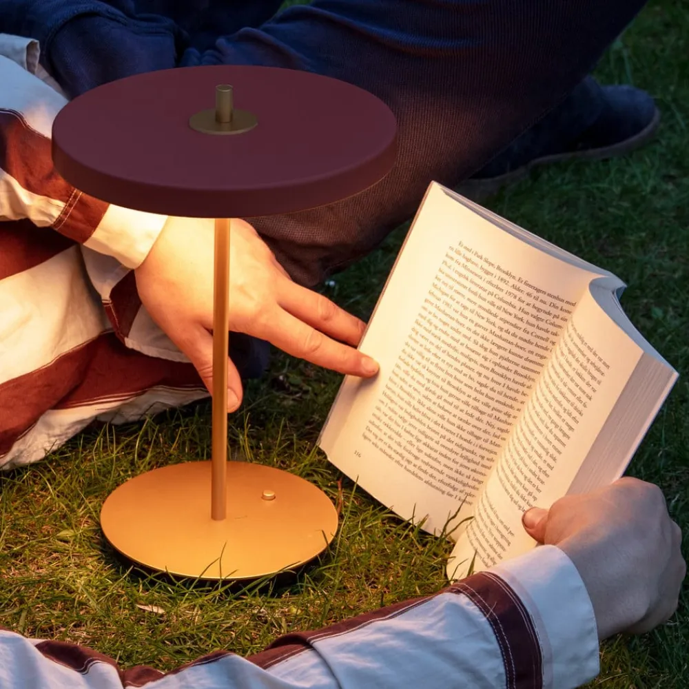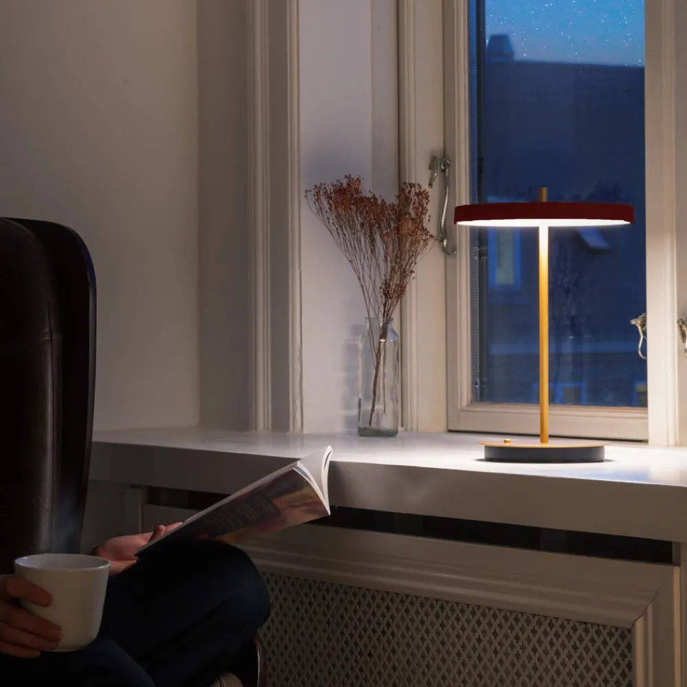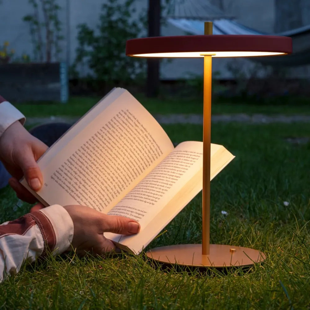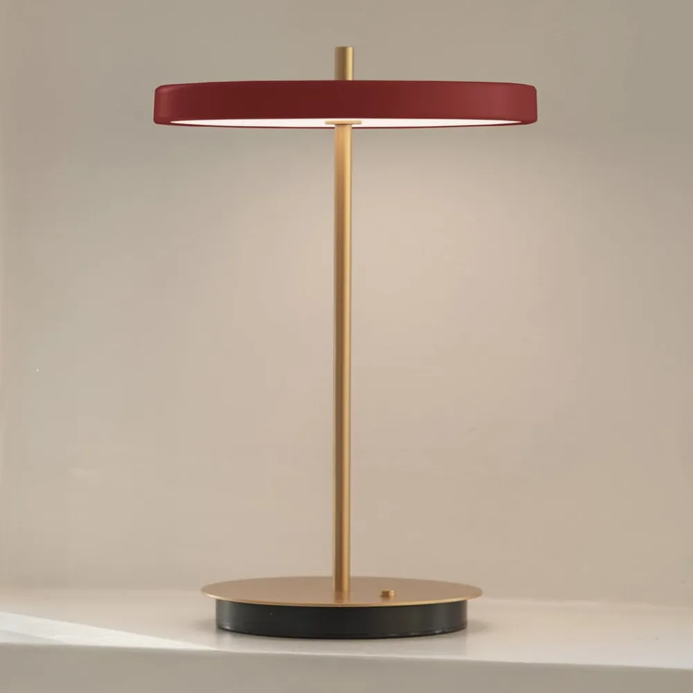 UMAGE Bordlamper>LED-batteridrevet bordlampe Asteria Move rubinrød/messing 31 cm