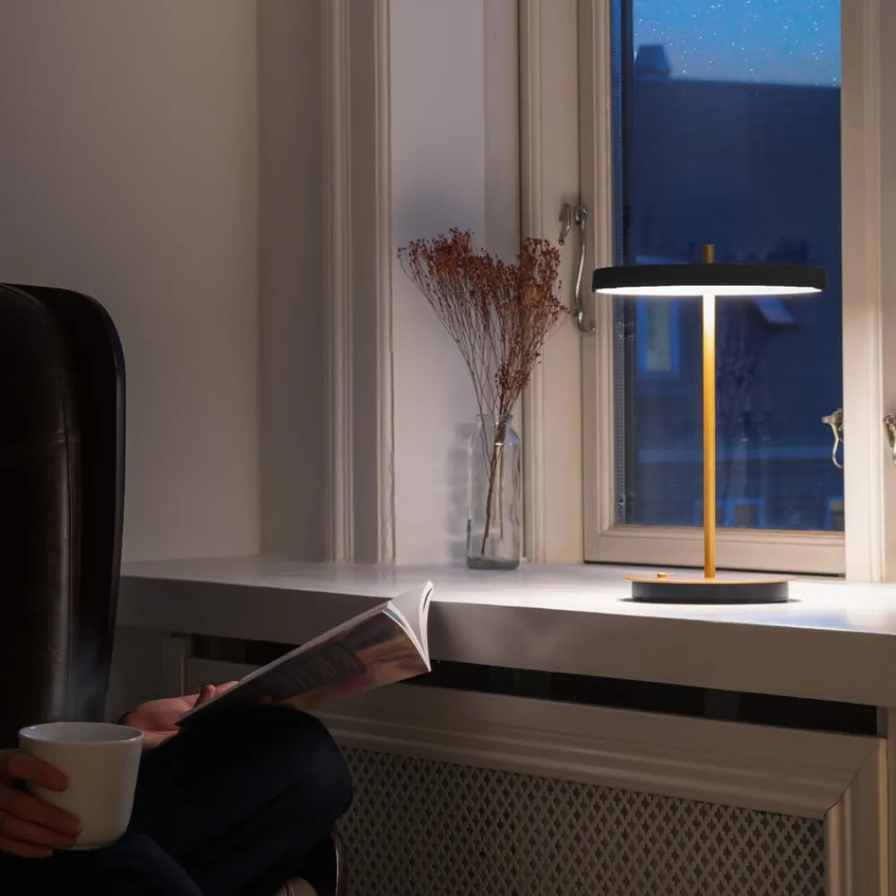 LED-bordlampe Asteria Move med genopladeligt batteri til bærbar funktion Graciøs og udstyret med utrolig bevægelsesfrihed kan LED-bordlampen Asteria Move fra det danske designhus UMAGE bruges overalt i hjemmet. Takket være det indbyggede lithium-ion-batteri kan lampen give lys i op til 35 timer i gennemsnit uden strømtilslutning. Den runde lampeskærm huser varmhvide LED’er, der udsender et hyggeligt og behageligt lys, som er blændfrit, blødt og jævnt fordelt til alle sider takket være den integrerede diffuser. Med touch-dæmperen på den runde, massive base kan lyset dæmper til fire forskellige lysstyrker ved at trykke flere gange på kontakten. Asteria-kollektionen er designet af medstifter og kreativ chefudvikler Søren Ravn Christensen. Designeren er autodidakt og har en sjælden evne til at kombinere design og økonomi. Han siger om sin kollektion: “Asteria-kollektionen, der er skabt i krydsfeltet mellem design, teknologi og håndværk, har integrerede LED-lys i en slank, minimalistisk form.” Sammen med den nuværende administrerende direktør, Jacob Nannestad Hansen, grundlagde Christensen virksomheden UMAGE by VITA copenhagen i 2008. Producenterne af designerlamper lægger særlig vægt på bæredygtige materialer og teknologi af høj kvalitet i produktionen af deres armaturer for at give kunderne det størst mulige udbytte. Konceptet er en succes. I dag har den danske belysningsvirksomhed over 1.500 afdelinger i mere end 50 lande verden over – bærbar – batteridrevet – lysstyrken kan justeres i fire niveauer: 1. niveau 5 lumen ca. 168 timer 2. niveau 20 lumen ca. 50 timer 3. niveau 50 lumen ca. 20 timer 4. niveau 100 lumen ca. 10 timer