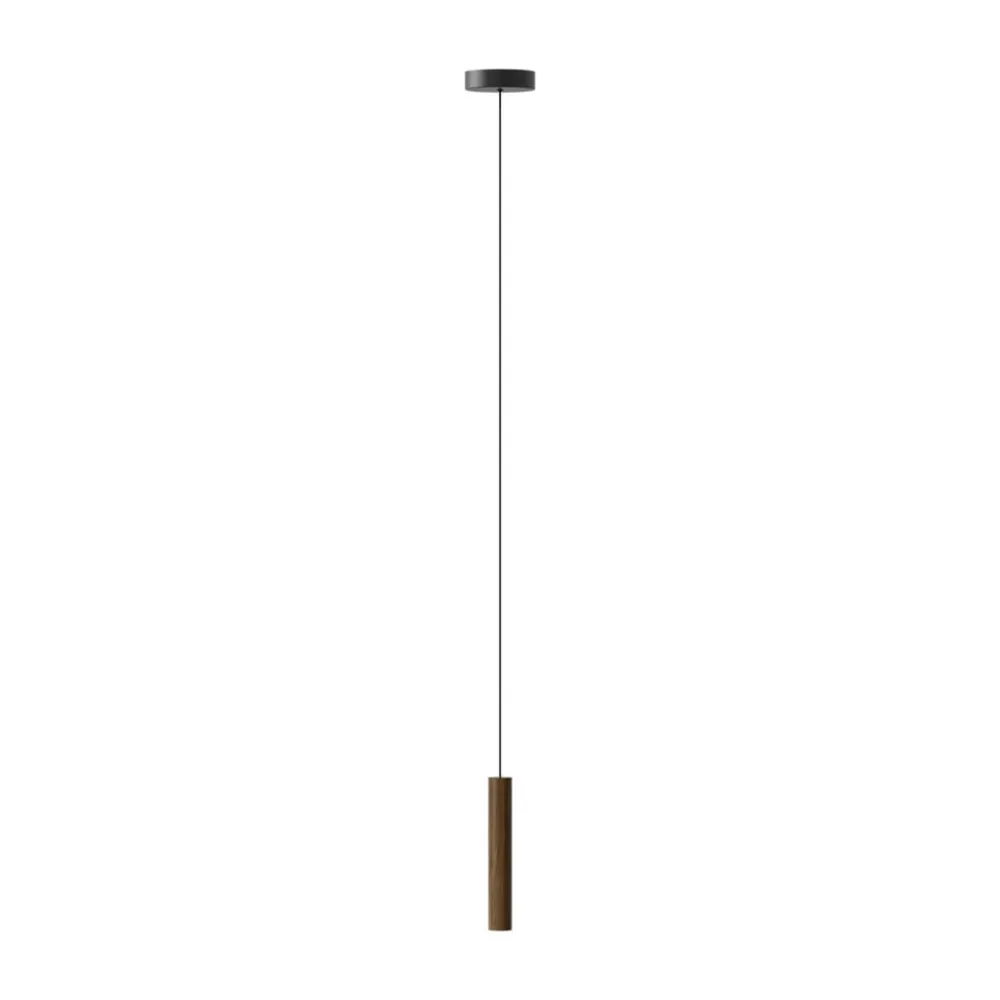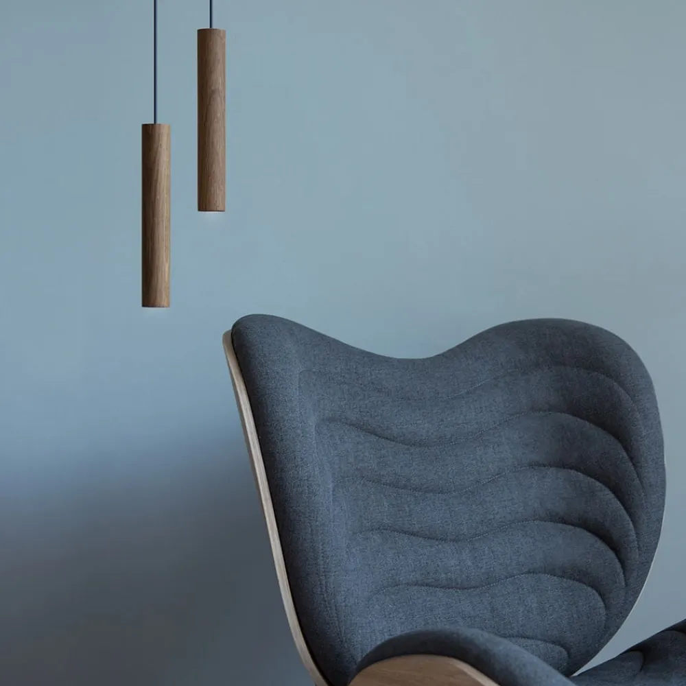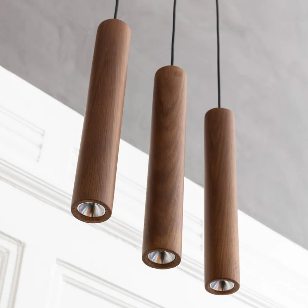 Den stavformede skærm på LED-hængelampen Chimes er fremstillet af ægte egetræ. Den tynde konstruktion på træskærmen skaber fokus på det udstrålende lys, lige som på et spotlight.