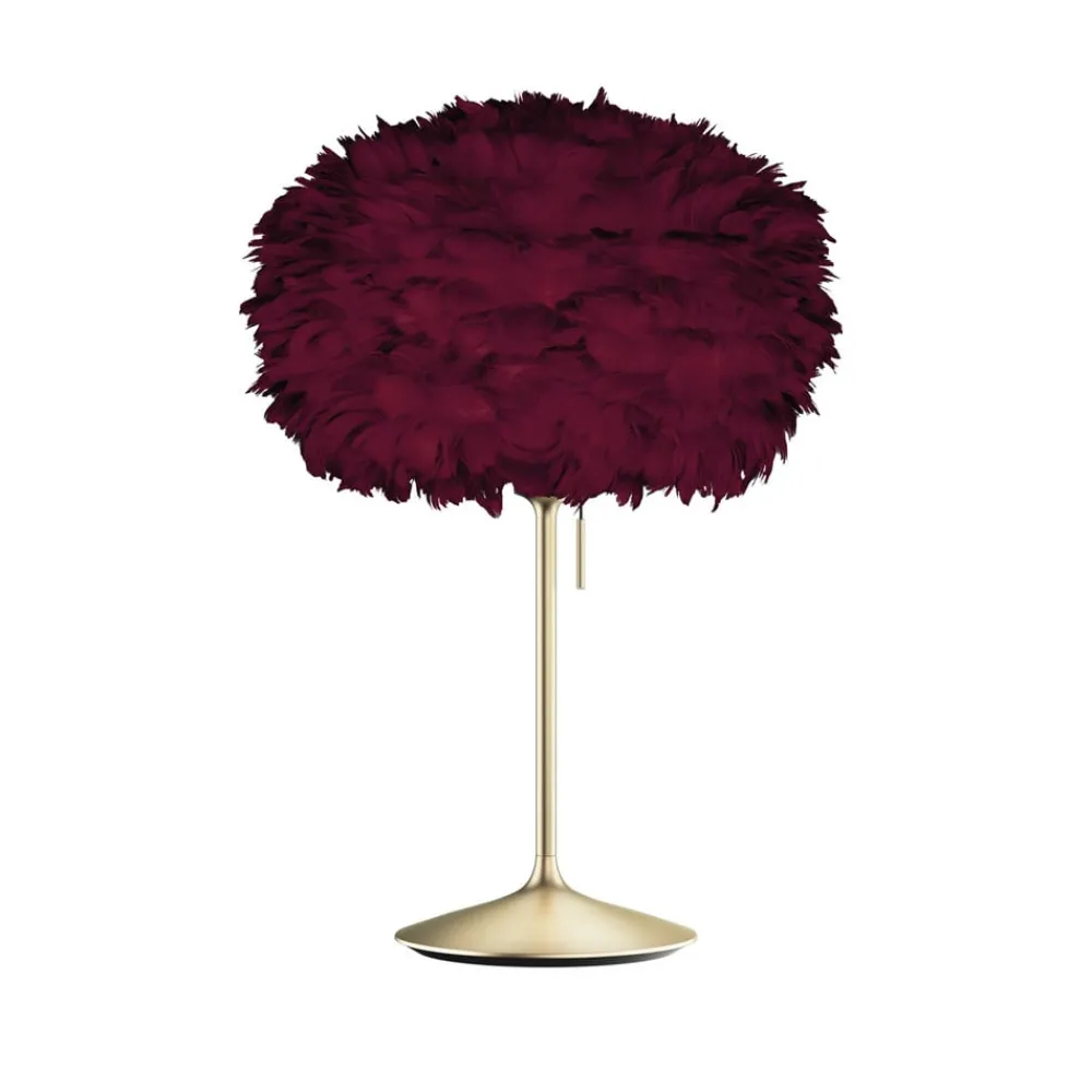 Bordlampe Eos medium – fluffy fjer skærm på metalramme i messing