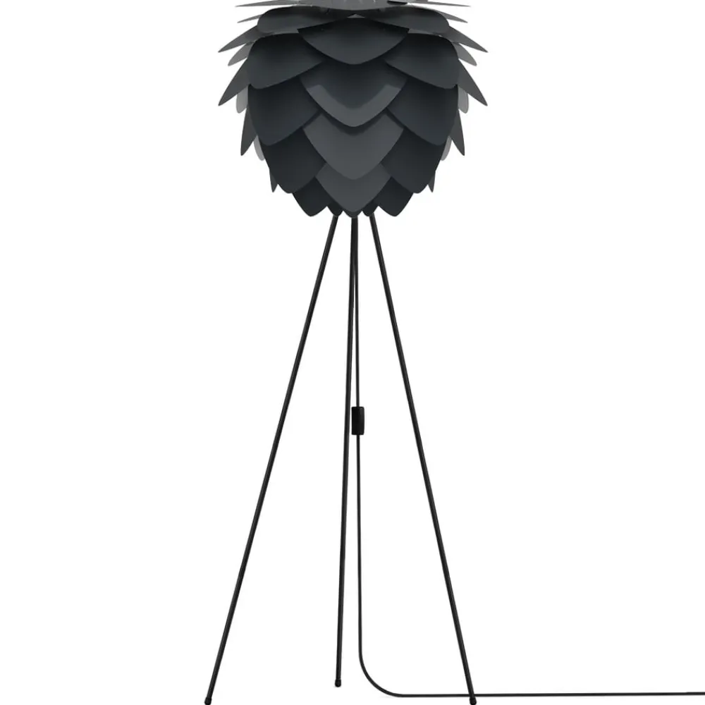 Antracitfarvet skærm og sort stel: Aluvia tripod gulvlampe To designs af den danske designer Søren Ravn Christensen, kreativ udvikler og medstifter af belysningsfirmaet UMAGE, er her blevet kombineret for at skabe en gulvlampe, der er uovertruffen med hensyn til æstetik og funktionalitet. Den antracitfarvede Aluvia-skærm, som ligner en eksotisk plante takket være det ekstravagante bladdesign, troner på Tripod-stativet, som er lavet af sortlakeret aluminium. Aluvia-gulvlampen imponerer dog ikke kun med sit fascinerende udseende, men også med sin fænomenale lyseffekt, som gør den til en fremragende kilde til stemningsfuld accentbelysning.