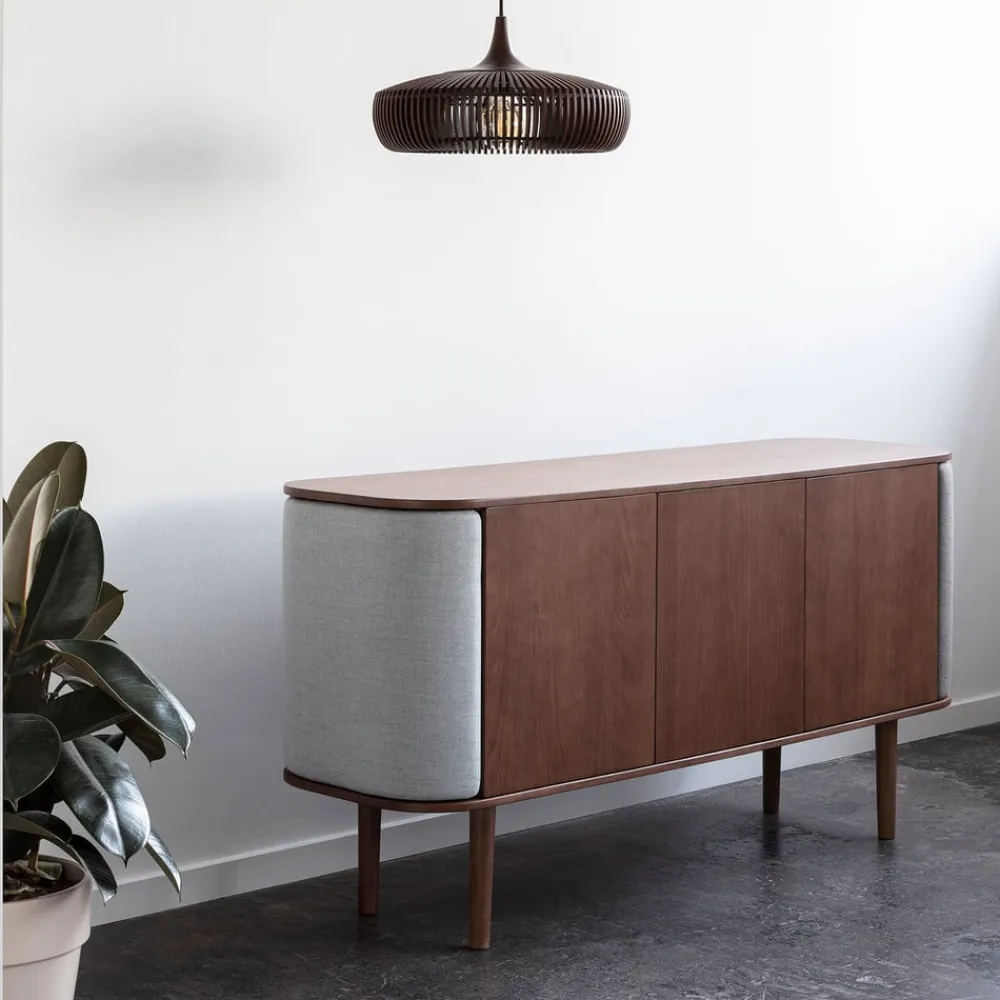 Træmaterialets mørke farve suppleres harmonisk med ophænget og loftsbeslag. Dette holdes sort og vises i form af en kugle, der udstråler en perfektion. Den blanke sorte farve understreger udseendet af høj kvalitet, mens tekstilledningen subtilt supplerer suspensionen.
