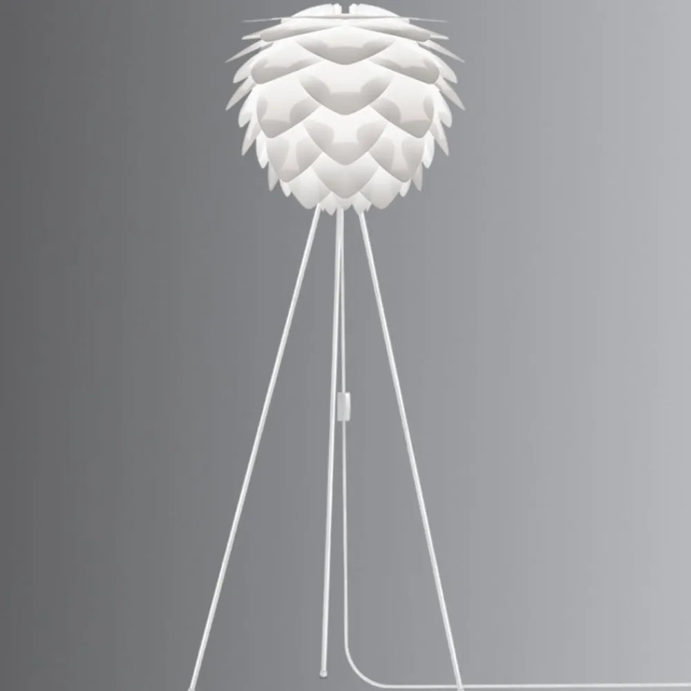 Den diskrete enkelhed i det hvidlakerede aluminiumsstel, står i stærk kontrast til lampeskærmens udseende. Skærmen er sammensat af hvide plastelementer, og takket være dens overlappende, trekantede blade fremstår den som et floralt element fra de sydlige lande. Når man tænder for lyset opstår der en accent omgivelsesbelysning til boligen. Med snorafbryder og 300 cm tekstilkabel.