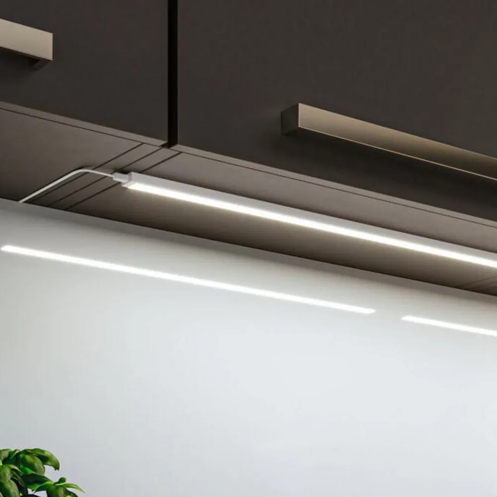 Moderne køkkenbelysning med bevægelsesstyring – Inline LED-underskabslampe, startsæt med to varmhvide armaturer Inline LED-underskabslampen er designet til funktionel belysning af køkkenbordplader. Den består af en slank aluminiumsprofil og afskærmning med rengøringsvenlige overflader og indeholder varmhvide LED’er. Der er integreret en PIR-sensor til betjening, som muliggør berøringsfri betjening – praktisk og hygiejnisk. Skift sker med en strygende bevægelse, inline-dæmpning er mulig ved at holde hånden foran sensoren – Startsæt med to armaturer, tilslutningskabel med plug-in-strømforsyningsenhed, tilslutningskabel, monteringsmateriale – Kan suppleres med forlængersæt (op til en maksimal samlet effekt på 24 W) – PIR-sensoren på det første armatur bruges til at styre alle andre tilsluttede armaturer sammen – Hukommelsesfunktion gemmer dæmpningsindstillingen