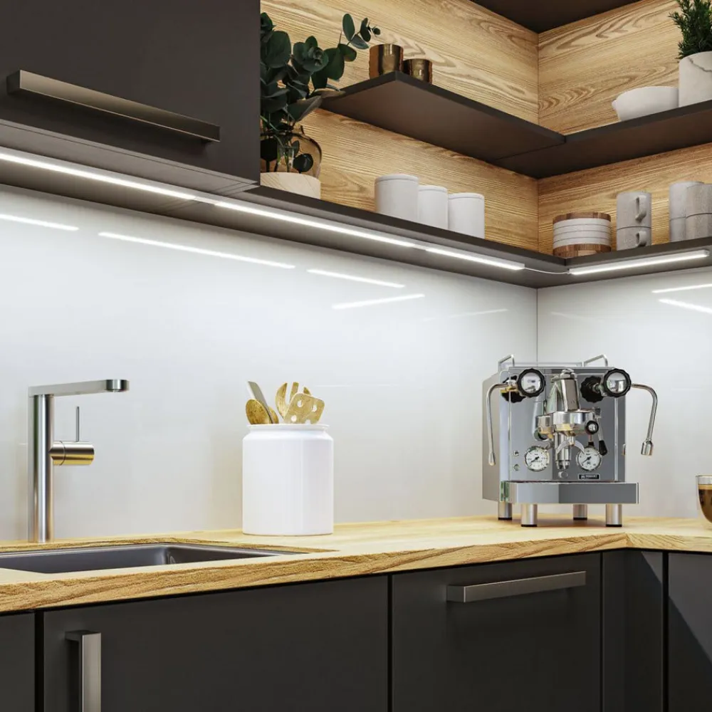 Moderne køkkenbelysning med bevægelsesstyring og justerbar lysfarve – LED underskabslampe Inline, startsæt med to lamper LED underskabslampen Inline er designet til funktionel belysning af køkkenets arbejdsflader. Den består af en slank aluminiumsprofil og en diffusor med overflader, der er nemme at rengøre. Der er integreret en PIR-sensor til betjening, så den kan betjenes berøringsfrit – praktisk og hygiejnisk. Lysfarven kan justeres fra varm hvid til dagslys ved blot at tørre sensoren af med hånden – Startsæt med to lamper, tilslutningskabel med plug-in-strømforsyningsenhed, tilslutningskabel, installationsmateriale – Kan suppleres med et forlængersæt (op til en maksimal samlet effekt på 24 W) – PIR-sensoren på den første lampe bruges til at styre alle andre tilsluttede lamper sammen – Hukommelsesfunktion gemmer den valgte lysfarve