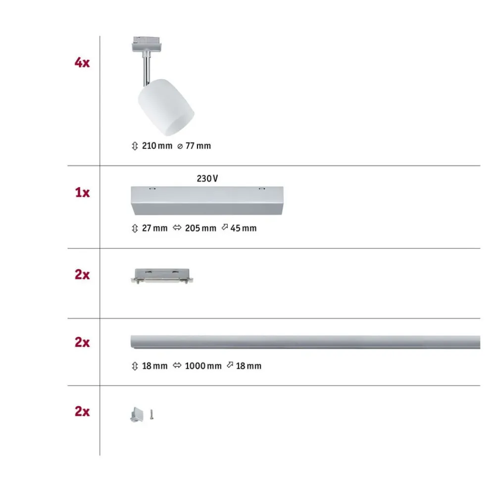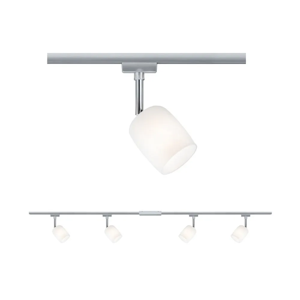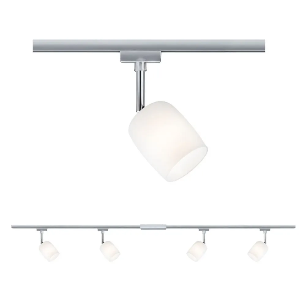 Dette basissæt til skinnesystemet URail omfatter skinner, forbindelsesstykker og strømforsyning i krom samt fire dekorative spots Blossom med satineret glasskærm. Inde i skærmene er der G9-fatninger. Inkl. fire spots, 2 x 1 m skinne, forbindelsesstykker, strømforsyning; ekskl. pærer. Kan udvides med ekstra skinner, lamper og tilbehør efter behov.