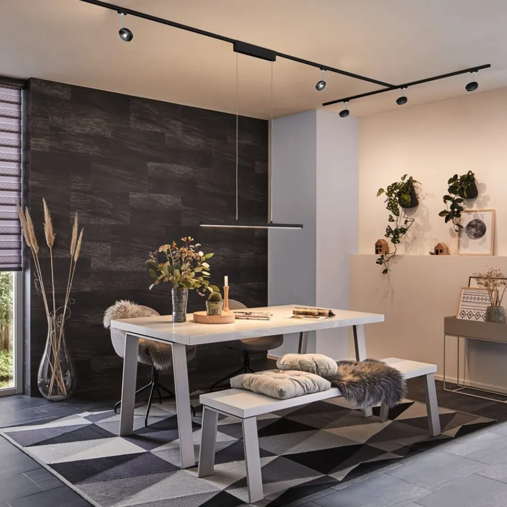 Dæmpbar Lento LED-pendel til URail-skinnesystemet med CCT-farveskift, ZigBee 3.0 Lento LED-pendlen i metal til Paulmanns URail-skinnesystem udsender sit lys både direkte nedad og indirekte opad. Det giver en god belysning hele vejen rundt. Den er fastgjort til baldakinen, som også er lavet af metal, via to kabler. Lento kan tændes og slukkes ved hjælp af den almindelige vægkontakt. Yderligere funktioner kan betjenes ved hjælp af passende ZigBee-baseret smart home-tilbehør, selv uden en bro. For eksempel kan lysstyrken dæmpes med den 2-bens vægkontakt fra Paulmann, og lysfarven kan også ændres med Gent-fjernbetjeningen. Begge muligheder er tilgængelige separat via tilbehøret. Hvis du vil have glæde af alle funktionerne, er det nødvendigt at integrere dem i et smart home-system via en ZigBee-bro. Paulmann tilbyder smik gateway, inklusive en gratis app til Android og iOS (se tilbehør). Alt kan derefter styres via smartphone eller tablet, og der kan også indstilles forskellige lysscener. Alternativt er det også muligt at integrere i et eksisterende ZigBee-kompatibelt smart home-system, såsom Philips Hue eller IKEA Tradfri. Tekniske egenskaber / kompatibilitet: – ZigBee 3.0-kompatibel – kompatibel med Paulmann smart home-fjernbetjening og vægkontakt (se tilbehør) – dæmpbar – trinløs justerbar farvetemperatur (efter integration i et smart home-system) – kompatibel med ZigBee-baserede smart home-systemer som Philips Hue eller IKEA Tradfri Bemærkninger: Denne LED-pendel er kun egnet til Paulmann URail-skinnesystemet.