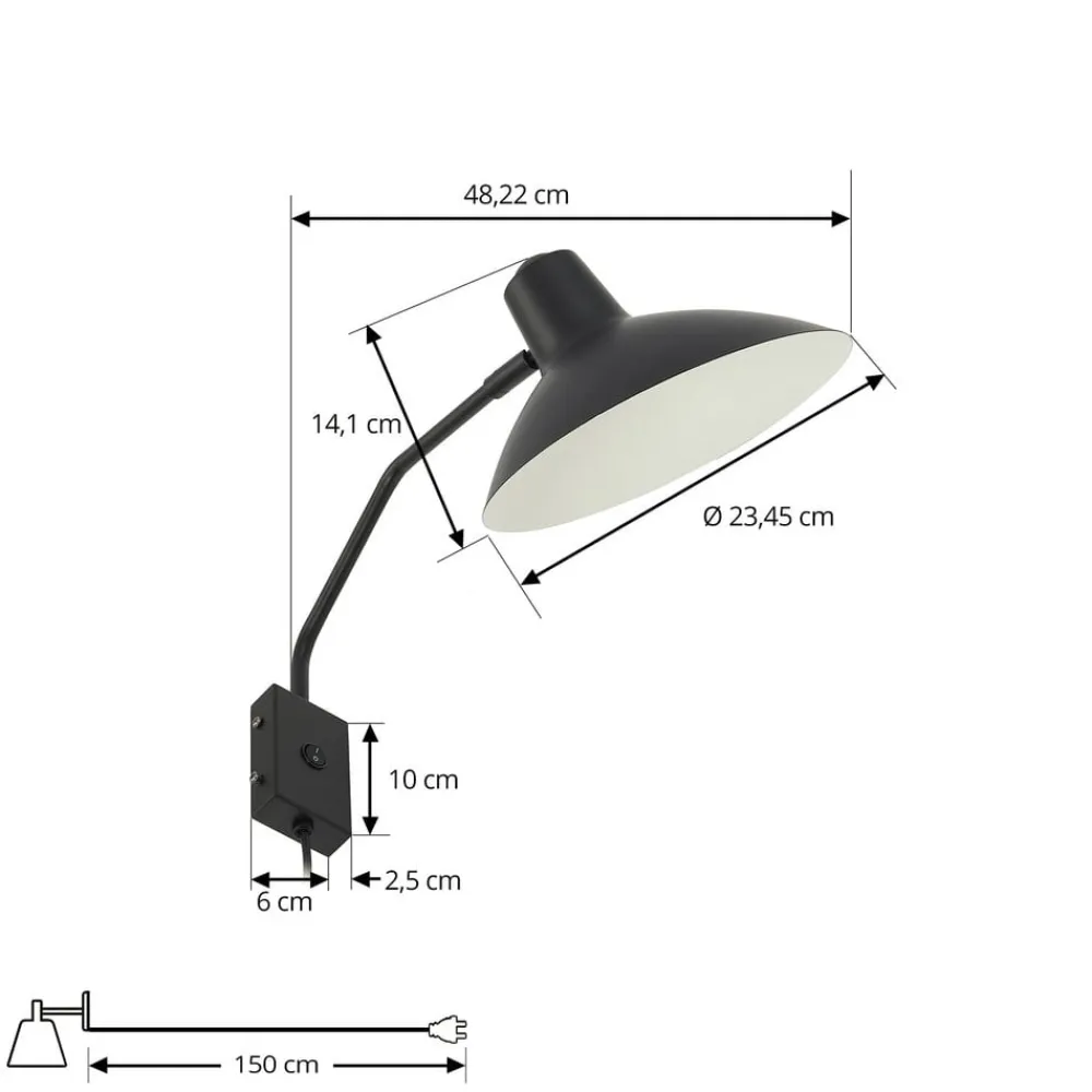 - Kabellængde 150 cm; vægmontering – højde 10 cm, bredde 6 cm; skærmhøjde 14 cm