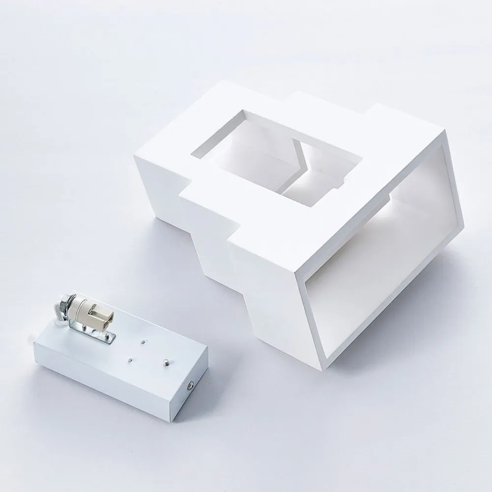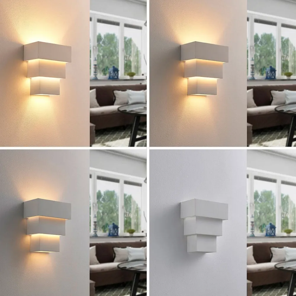 Tre-trins væglampe Antonella med hvid gipsoverflade Den kantede, tre-trins form på denne gips væglampe lader lyset slippe ud gennem hullerne på en særlig effektiv måde, hvilket skaber en meget hyggelig belysning i stuen. Ved hjælp af en passende LED-pære (medfølger ikke) forbruges der næsten ingen strøm, når Antonella er i brug, og den hvide gipsoverflade ikke bare spotlighter en harmonisk atmosfære, men kan også males.