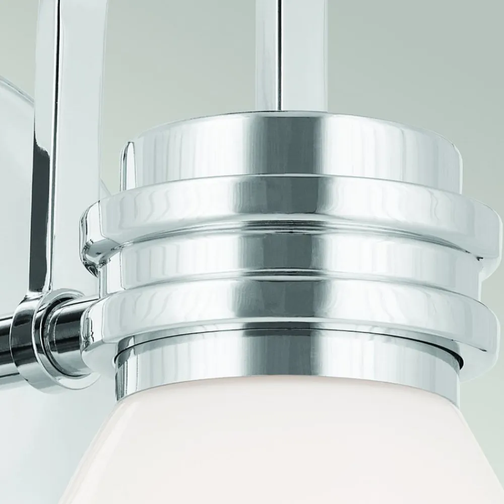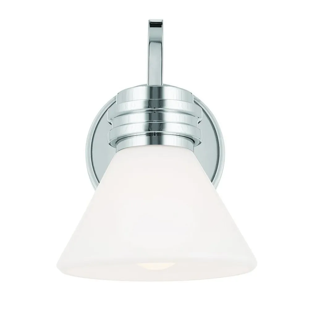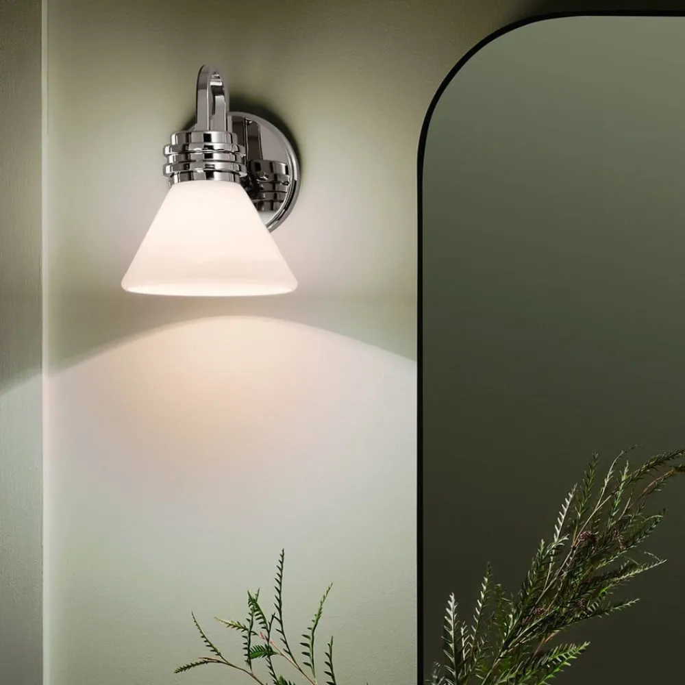Væglampe Farum 1 består af et stålstel og en opal hvid, kegleformet skærm i glas og er takket være kapslingsgrad IP44 perfekt til badeværelset, hvor den placeret ved siden af spejle giver et flot look og harmonisk belysning. Lampen med G9-fatning leveres med LED-pære med varmhvid lysfarve, som er nem at udskifte.