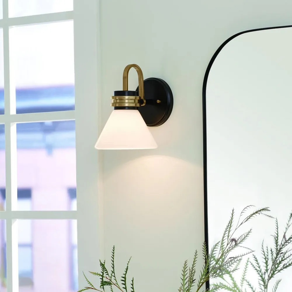 Væglampe Farum 1 består af et stålstel og en opal hvid, kegleformet skærm i glas og er takket være kapslingsgrad IP44 perfekt til badeværelset, hvor den placeret ved siden af spejle giver et flot look og harmonisk belysning. Lampen med G9-fatning leveres med LED-pære med varmhvid lysfarve, som er nem at udskifte.