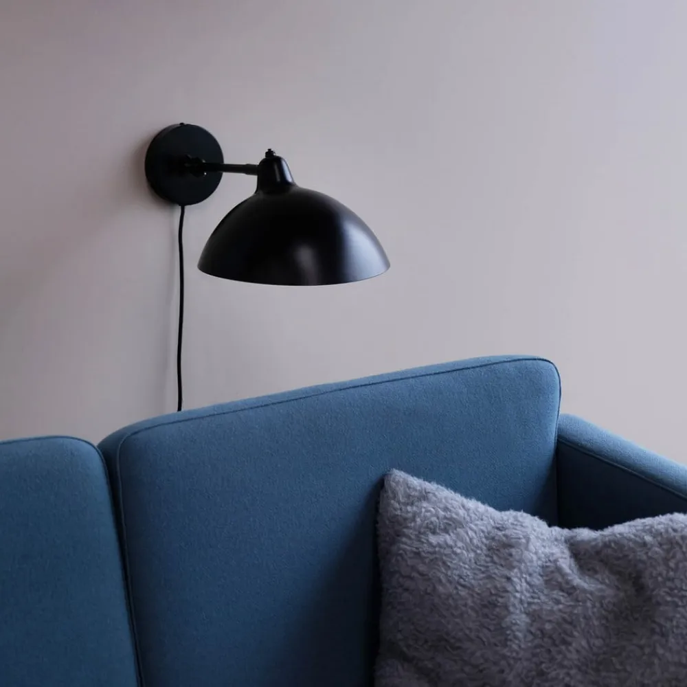 Futura væglampe med drejelig lampearm Futura væglampen med den brede, drejelige arm passer ind i mange indretningsstile takket være den neutrale sorte farve. Ideel som læselampe på væggen over sofaen eller over sengen. Nem at betjene med en kontakt på lampehovedet.