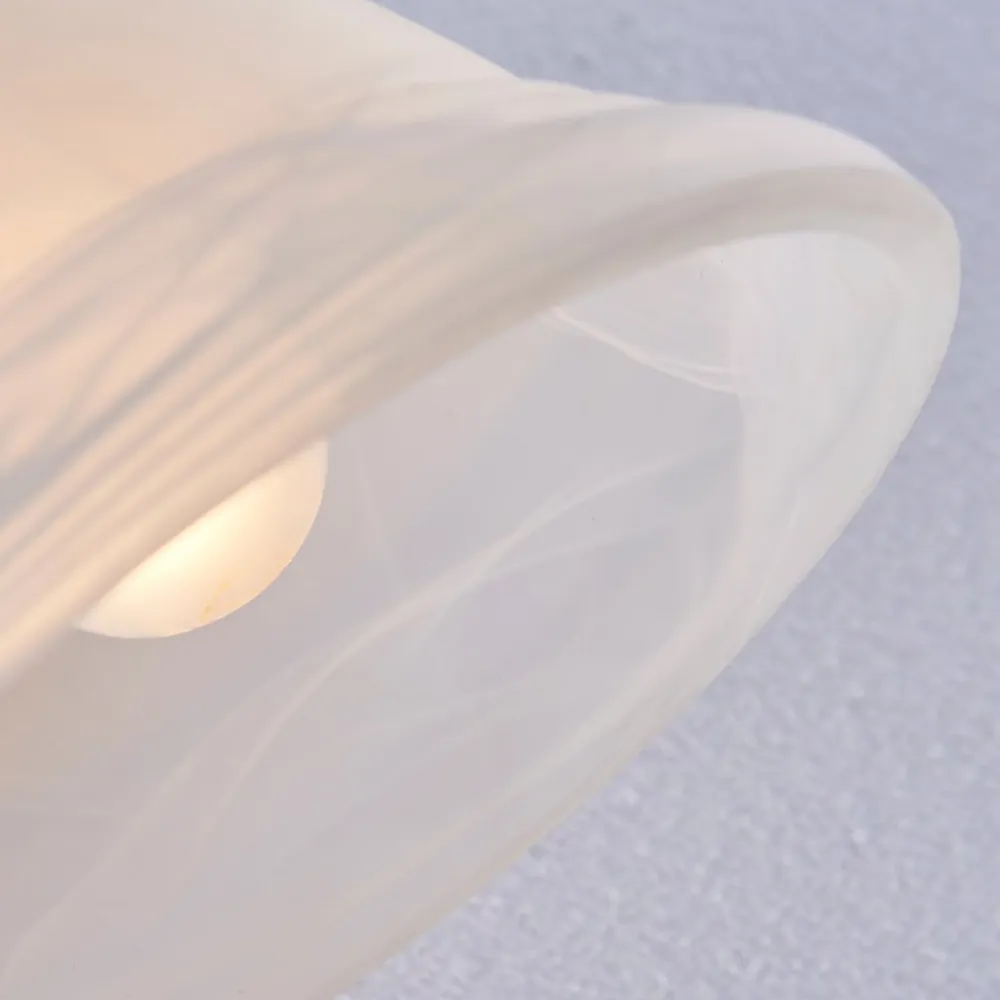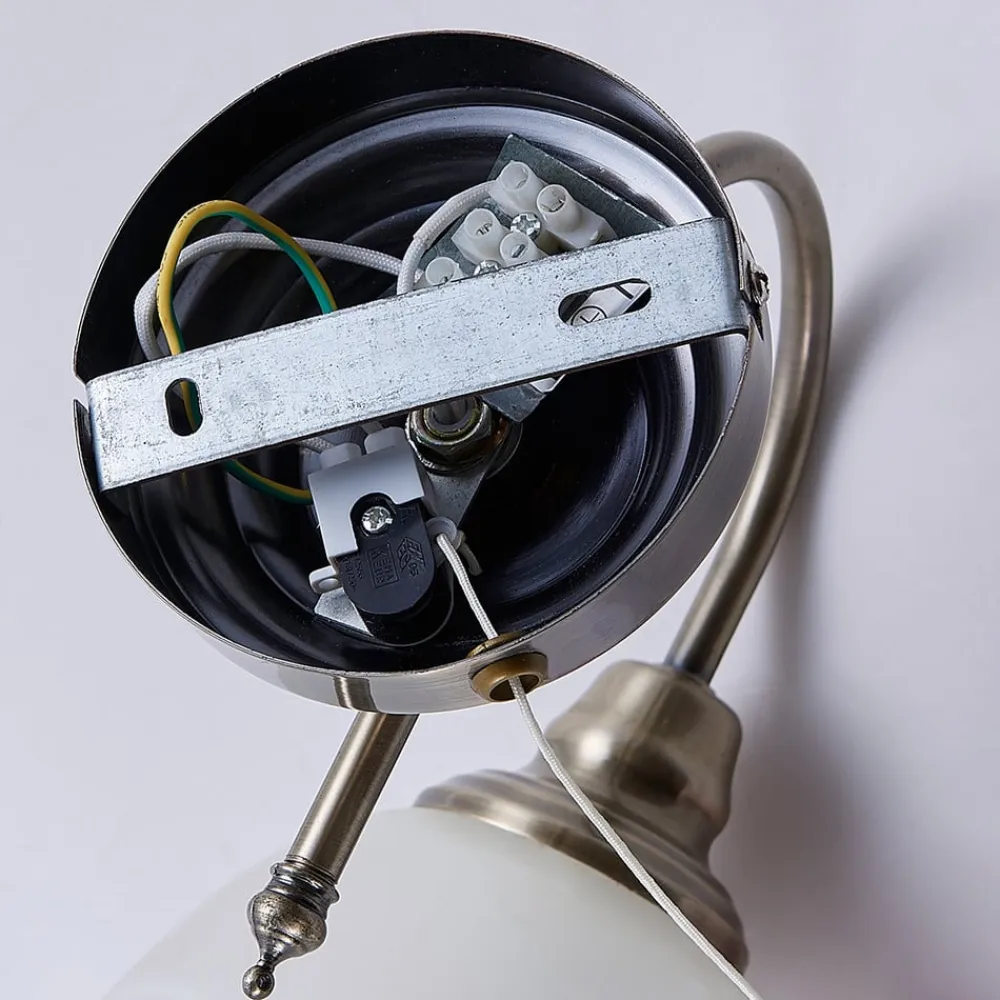 Hanna væglampe med trækkontakt i klassisk stil Væglampens ramme og skærm arbejder harmonisk sammen og gør Hanna til en lyskilde med et attraktivt udseende. Rammen, som består af et vægbeslag og en buet arm, har et nostalgisk udseende med sin antikke messingfinish, og skærmen har den typiske alabast-look tåge i glasset, som ikke bare kommer til sin ret, når den er tændt, men ser smuk ud, selv når væglampen stadig er slukket. For at tænde den skal du blot trække i den permanent installerede trækkontakt, og den valgte pære vil lyse op.